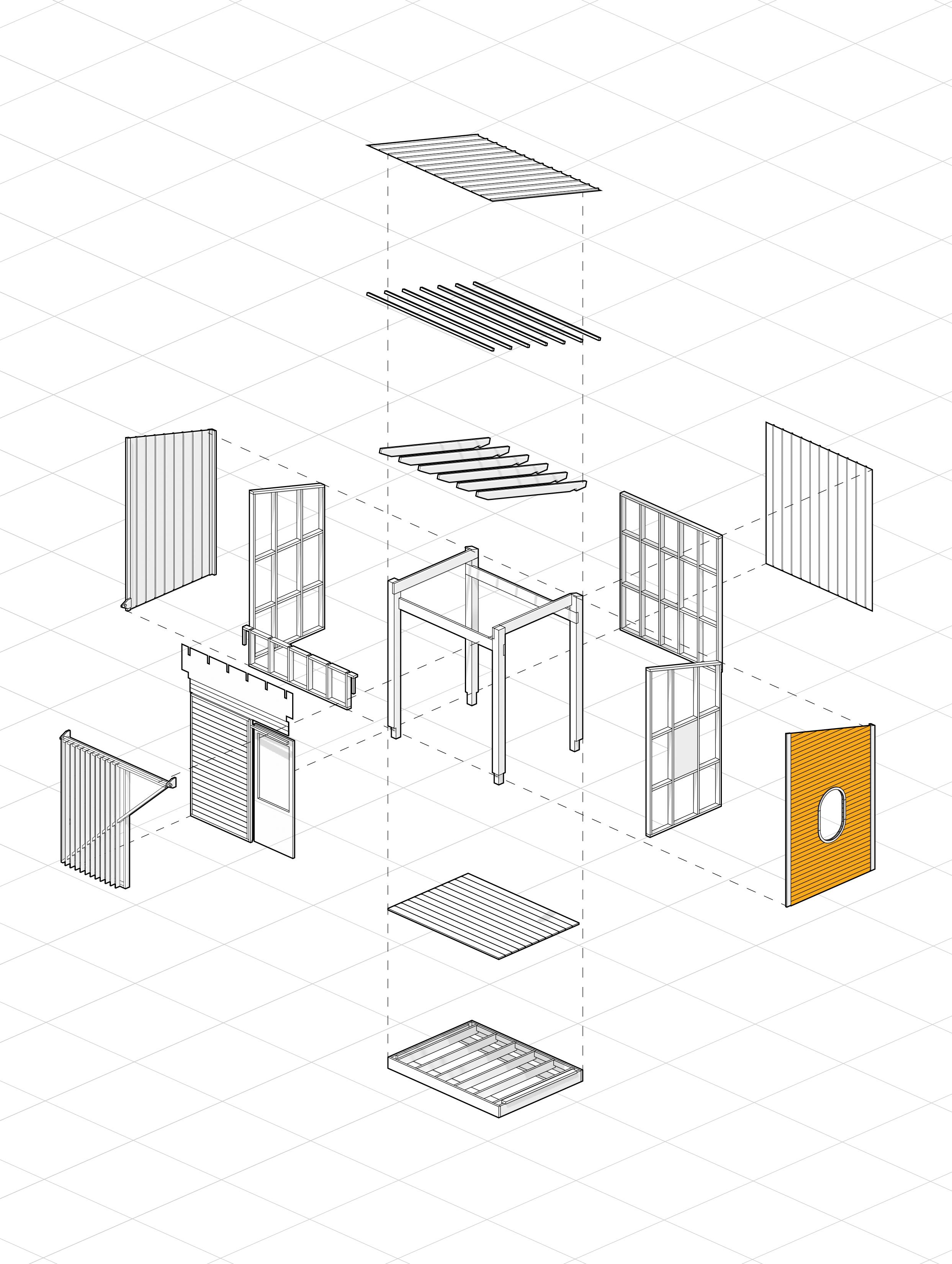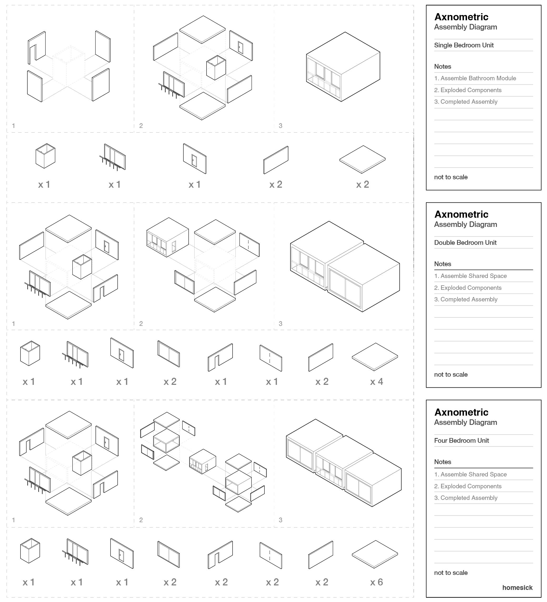 Assembly Diagram: Assembly diagrams show how each unit type is assembled and the corresponding number of pieces needed for construction. Modularity allows for faster manufacturing times and easier transportability for assemblage on site.