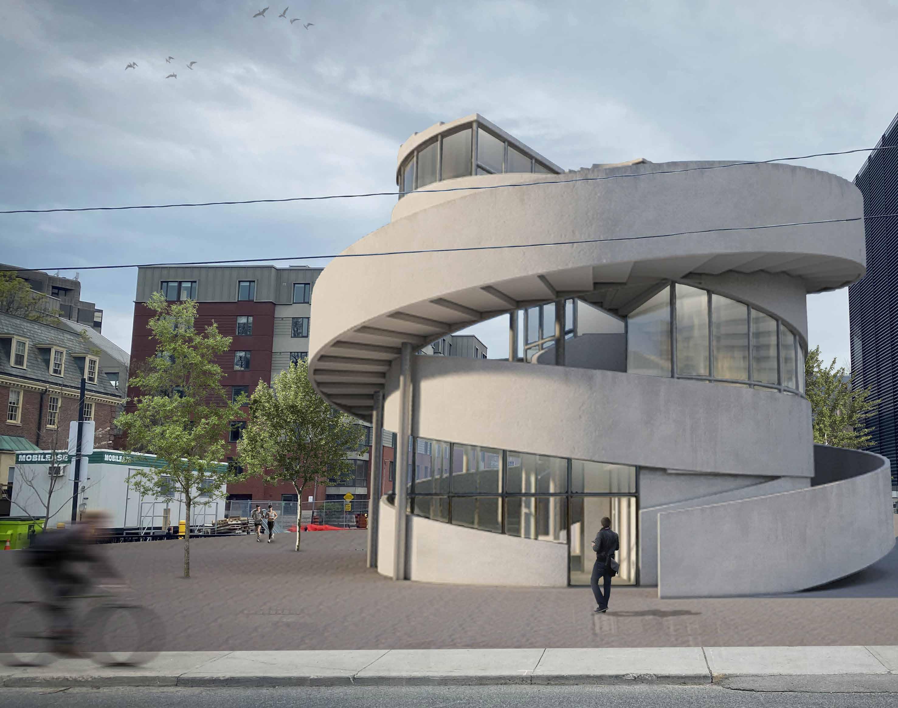 Located behind the University of Toronto’s Goldring Centre for High Performance Sport is the Spiral. The Spiral pushes the boundaries of the architectural typology of the spiral staircase to create an immersive experience evoking a maze-like experience of movement. The basic spiral staircase is used to capture the user inside a labyrinth-like space where function follows form.