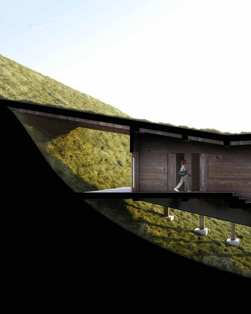 Furthermore, by steeping down into the landscape, the building establishes itself subtly and blends within the context. Being a UNESCO World Heritage Site, the house uses a landscaped rooftop which carries the same grass to help the building blend in and emerge from the mountain.