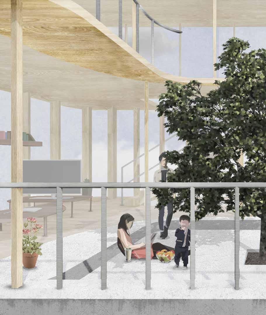 Flow of movement is established when staircases overlap by forming platforms which allow people to swap from one staircase to the other. The rooms have their roofs created from these spiral stairs while a larger roof is seen on top to prevent overheating caused by the sun. Lastly, the staircases connect to each other to create one continuous staircase covered by a mobius strip.