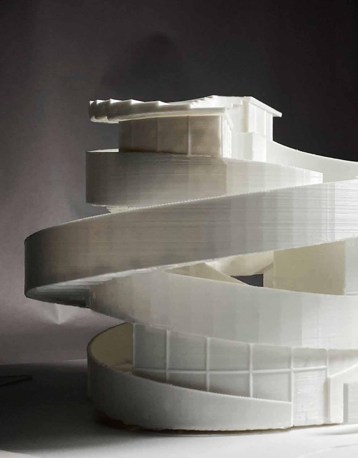 1:50 Physical Iterative Modelling: Iterative modelling plays an important role in the design process through experimentation. The model on the top encapsulates the essence of Spiral through the horizontal plane while the model on the bottom does so through the vertical plane.