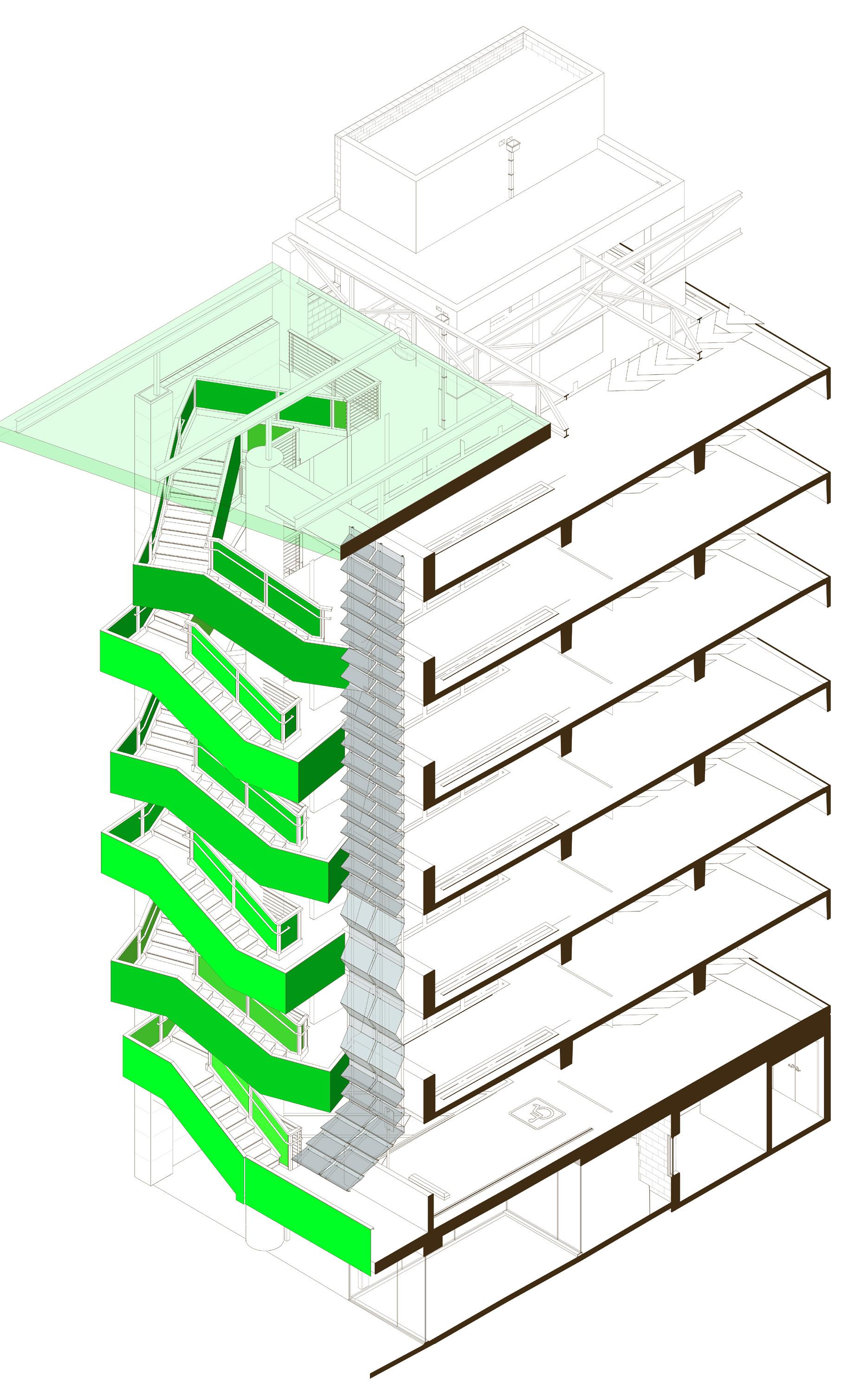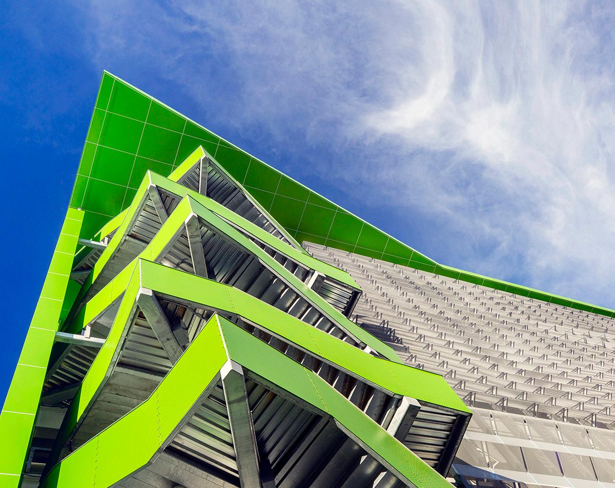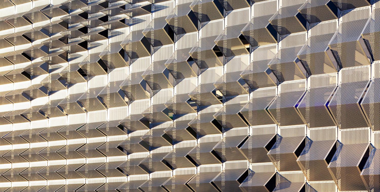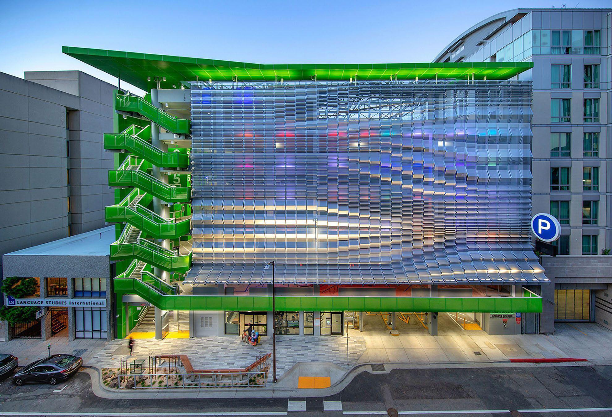Located in downtown Berkeley, CA, The Center Street Garage accommodates a growing population of theater goers, college attendees, & overflow from visitors to BAMPFA. Designed to conceal a multi-level parking garage, perforated bent aluminum panels of varying degrees are back lit to accentuate the undulating metal facade, masking the cars behind. The circulation extends out beyond the threshold of the building to create a dynamism traditional parking structures lack. Distinct colors are used to distinguish the Center Street facade from the Addison Street facade. The Center Street Garage has received multiple national & international design awards