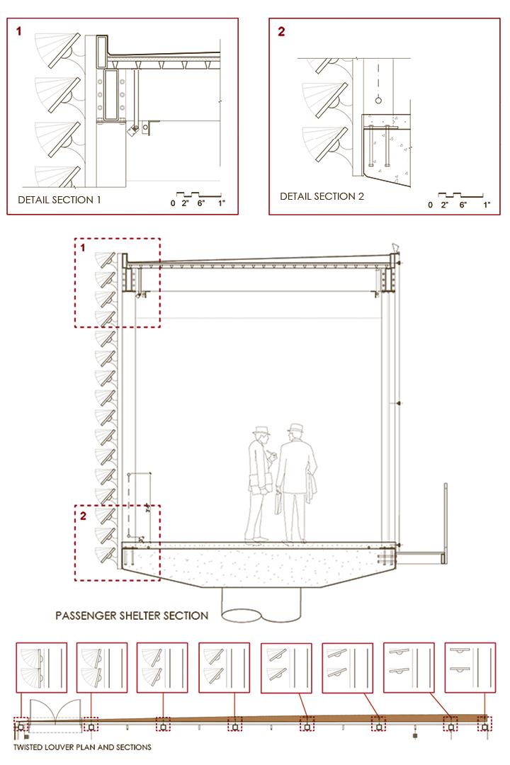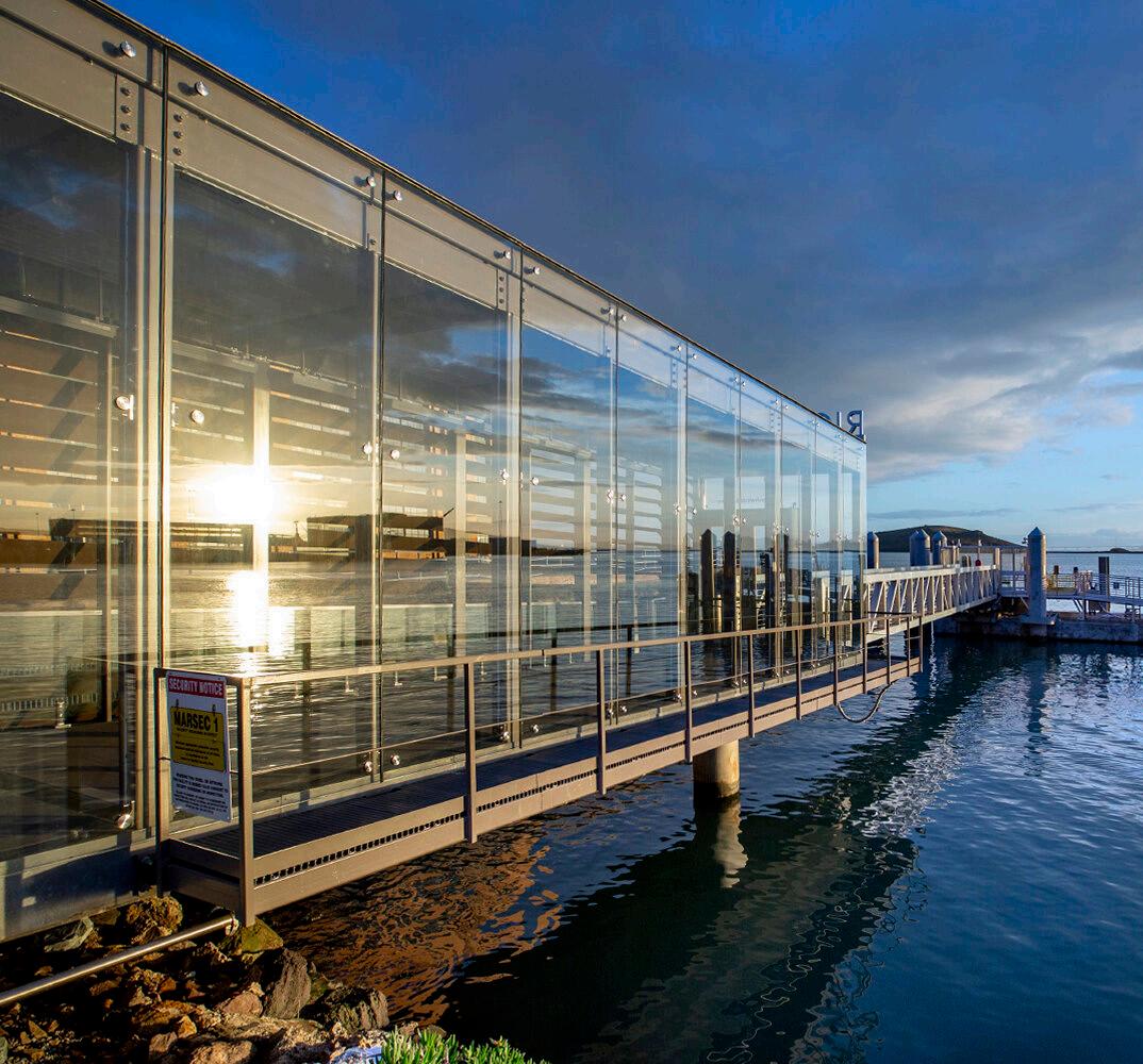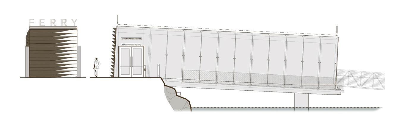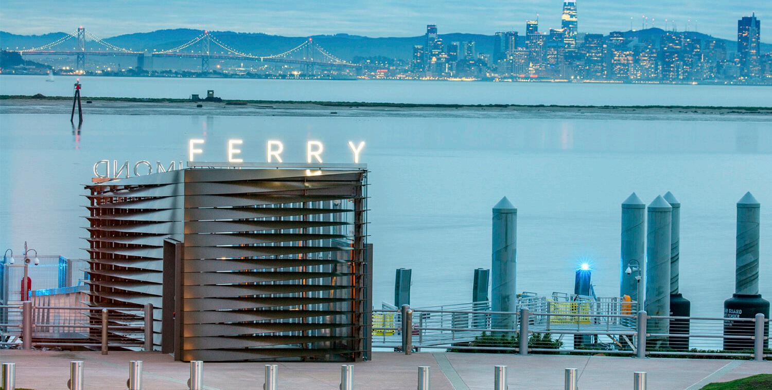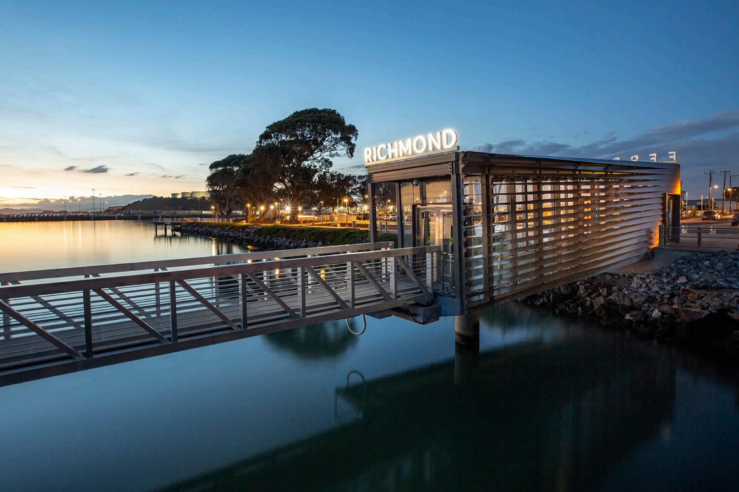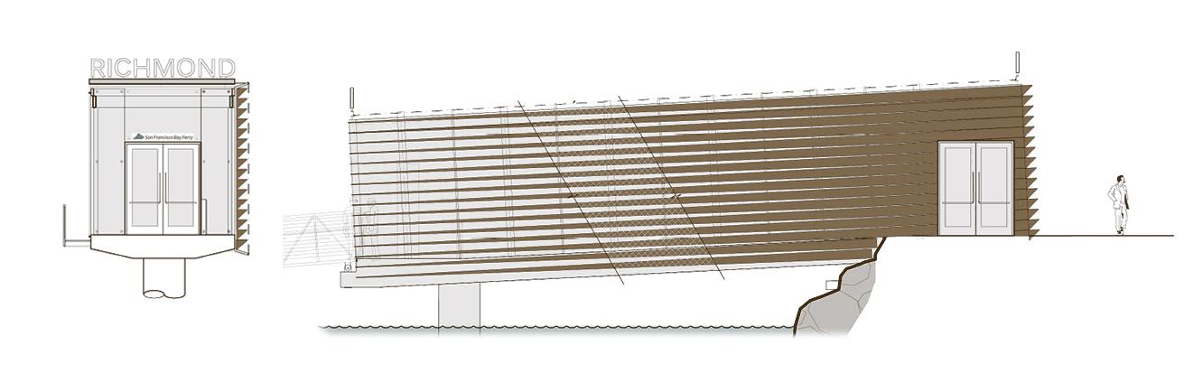 The Richmond Ferry Terminal, recipient of multiple design awards, is the first of its kind in the city, brining a vital connection between it & San Fransisco for essential commerce. Located within the Rosie the Riveter World War II Home Front National Historical Park, its waterfront location & sprawling views of nearly the entire bay are the impetus to the terminal’s design. The terminal is glazed on all four sides, giving patrons unobstructed views of the entire San Fransisco skyline. Copper colored louvers along the western facade gradually twist from vertical to horizontal as you progress out & onto the gangway.