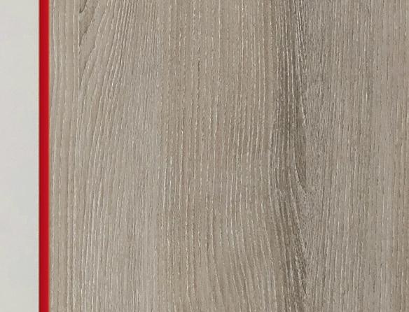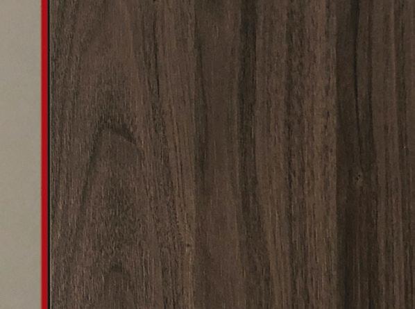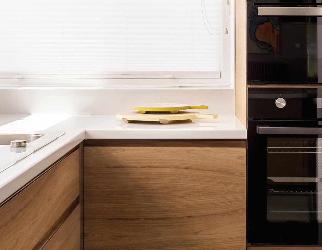 • Sleek flat slab cabinetry combining textured wood grain and super matte door finishes with panelled fridge and dishwasher