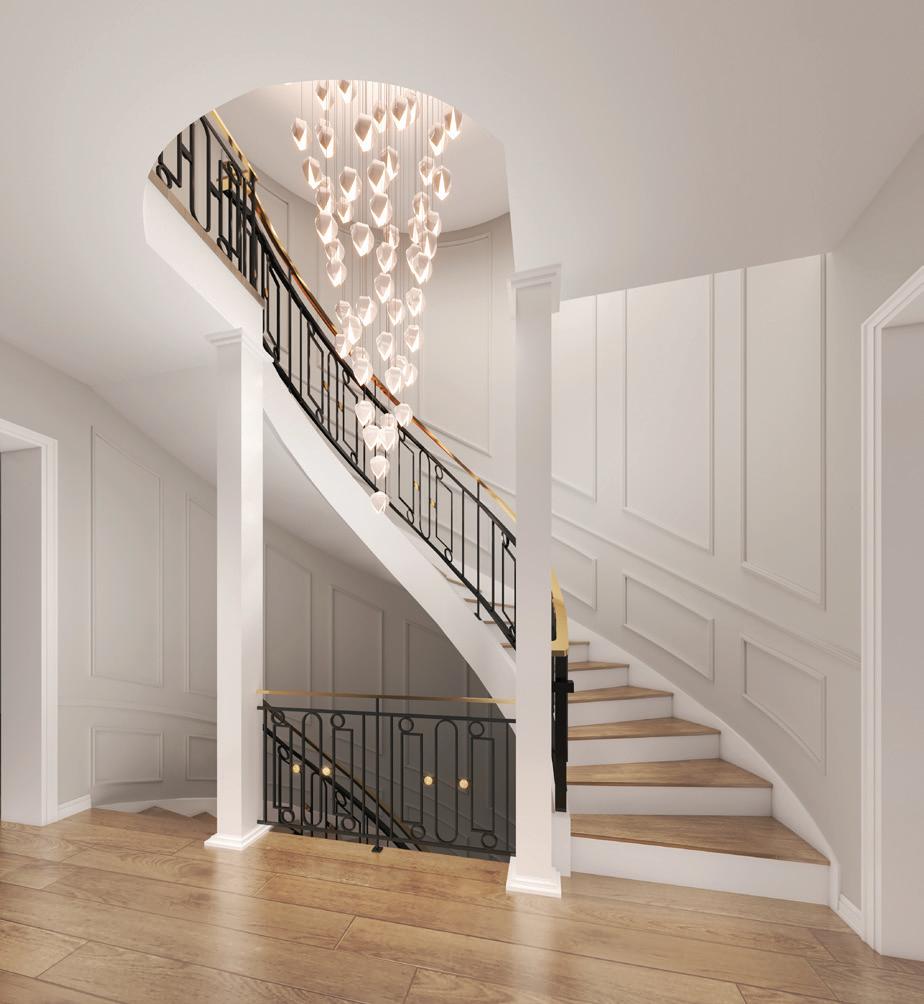 Exquisite Oak veneer stairs in a natural finish with decorate steel spindles