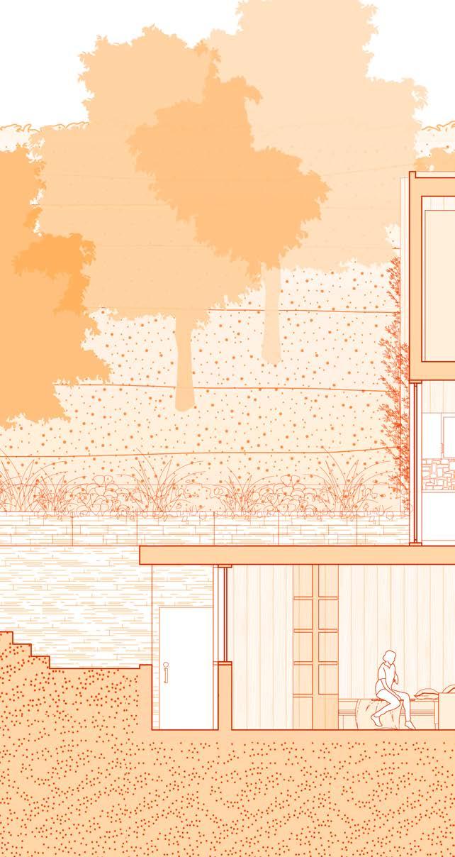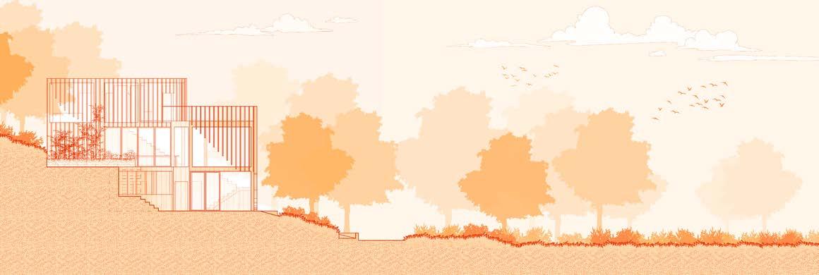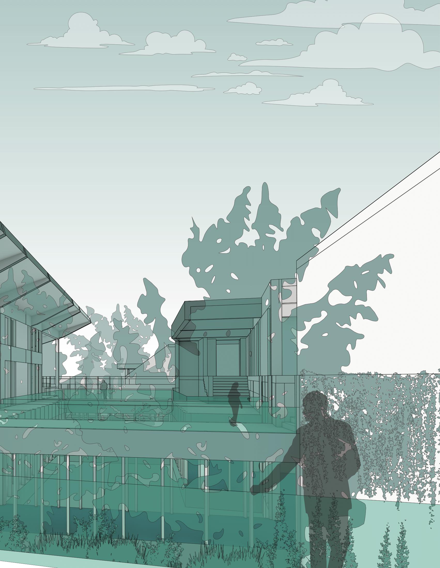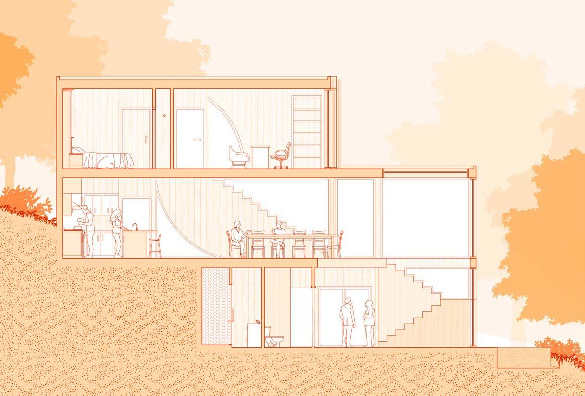 Built into the slope of an existing park, this project is designed to house a single resident and a temporary guest, while also facilitating enough space to host larger gatherings in collaboration with the CKCKW (Community Kitchen Co-operative Kitchener-Waterloo). By limiting the building’s massing to a selection of basic shapes and curves, the negative spaces formed by the generously sized windows accentuate the impression that the structure becomes embedded within its site.