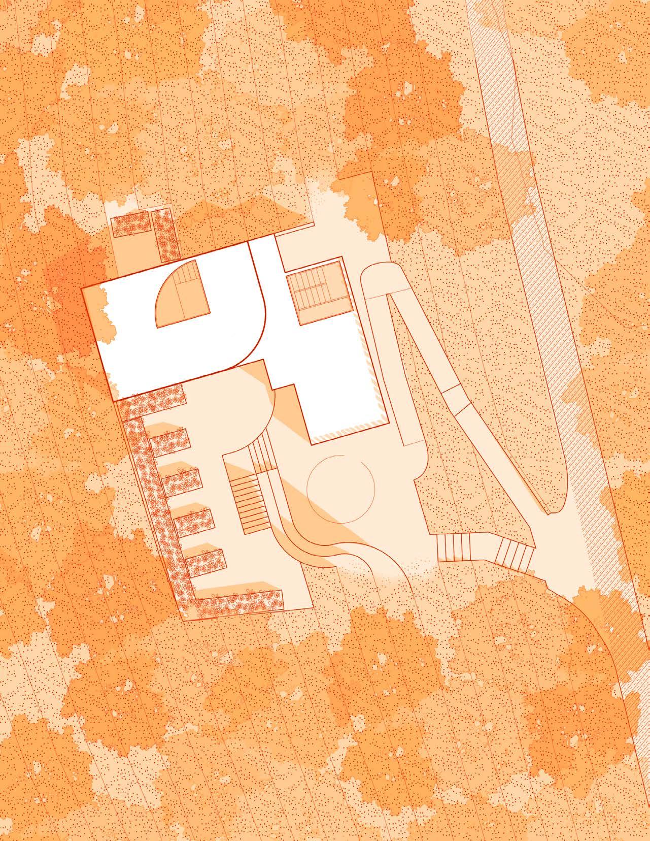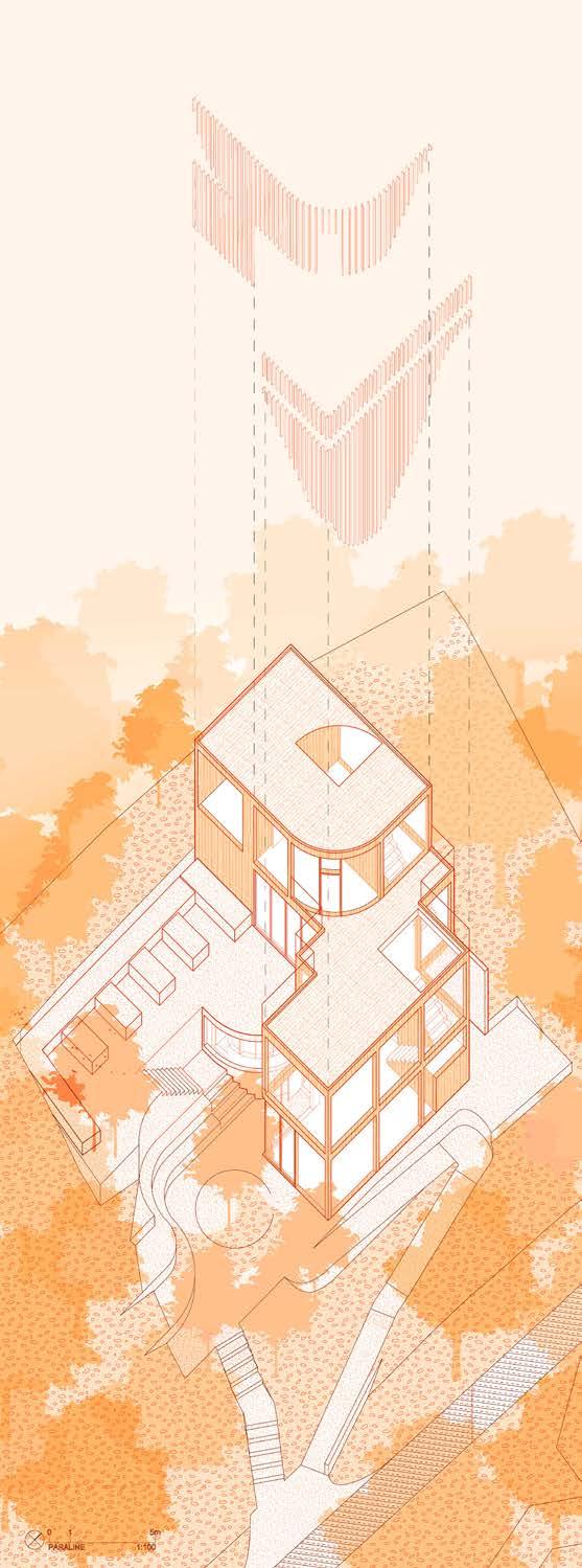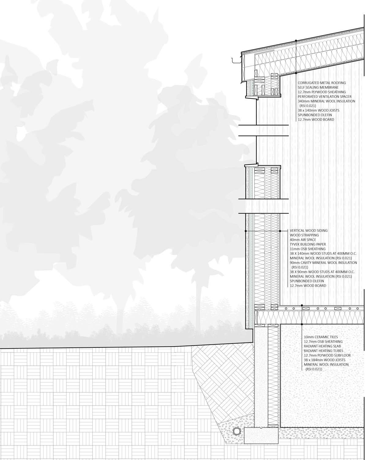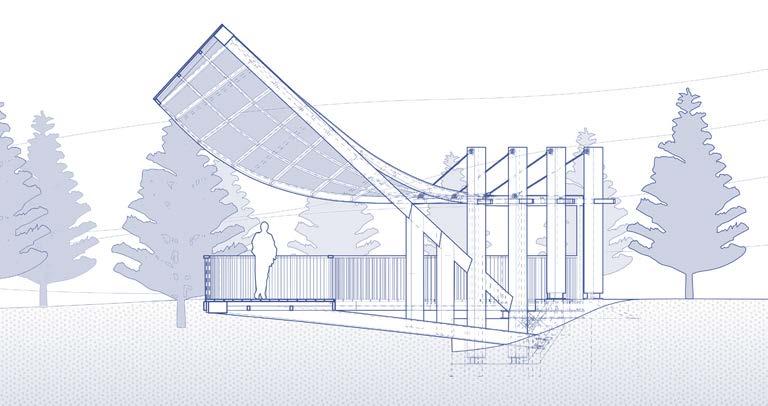 Built into the slope of an existing park, this project is designed to house a single resident and a temporary guest, while also facilitating enough space to host larger gatherings in collaboration with the CKCKW (Community Kitchen Co-operative Kitchener-Waterloo). By limiting the building’s massing to a selection of basic shapes and curves, the negative spaces formed by the generously sized windows accentuate the impression that the structure becomes embedded within its site.