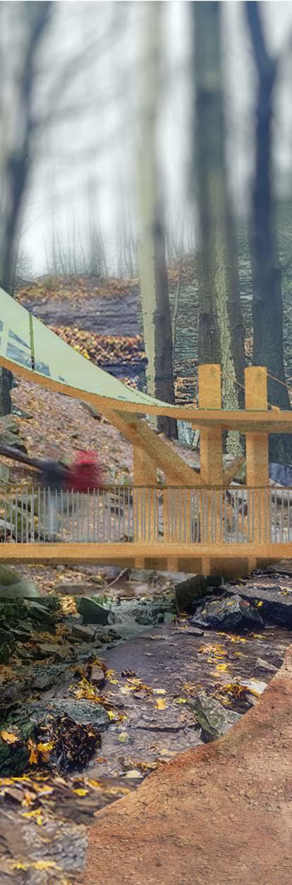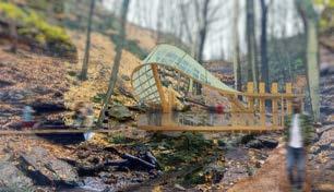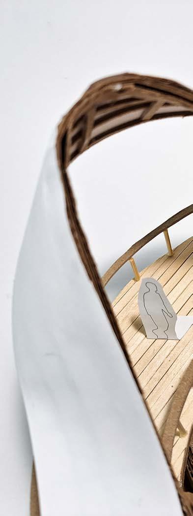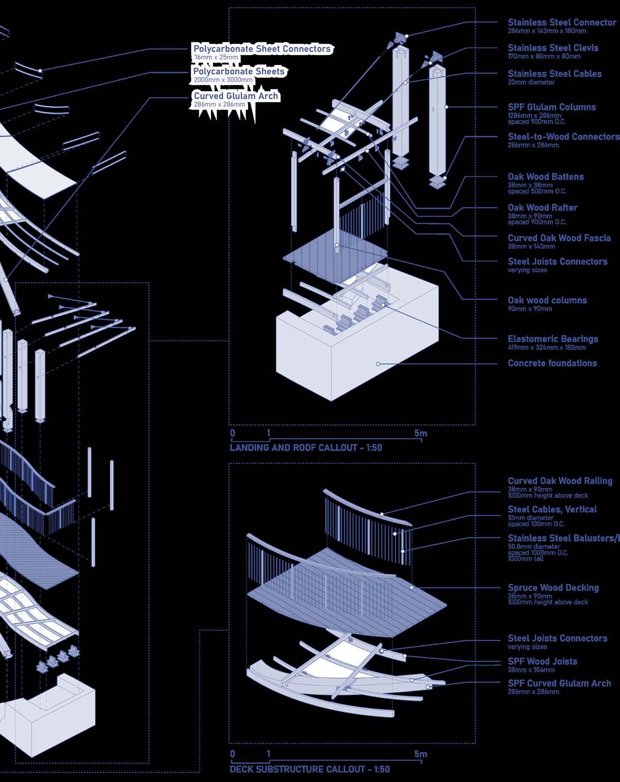 The main structure of the bridge is made predominantly from glulam beams and arches. It was decided early on that the use of such a material would allow us to create the curved movements that were desired for this project, while the natural texture of the exposed wood structure would blend in more cohesively with the forested site and its surroundings in contrast to something more aggressive like steel.