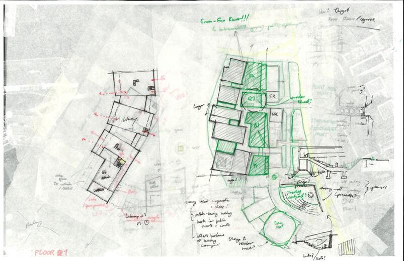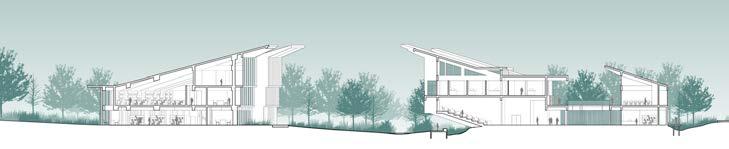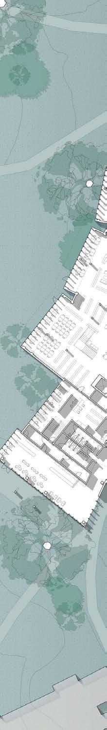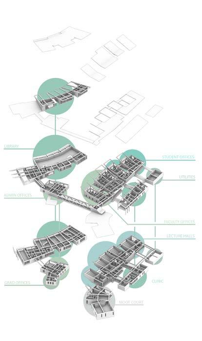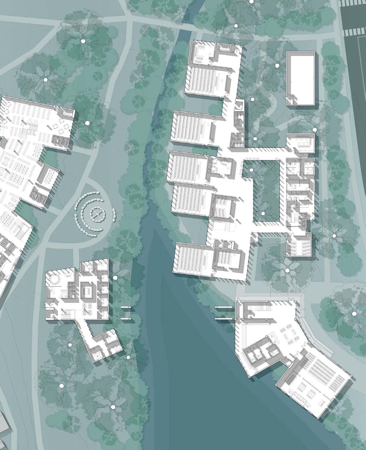 The Creekside Law School was designed with 3 main principles in mind; Transparency, Flexibility, and Ecology, under the pretense that where learning can and should occur anywhere, especially outside the classroom. This law school attempts to dismantle this preconception with the profession, whereby instead of a large singular building, the law school is split into multiple smaller segmented buildings, each able to function semiautonomously while still remaining interconnected to the rest of the “campus” with a series of indoor and outdoor walkways.