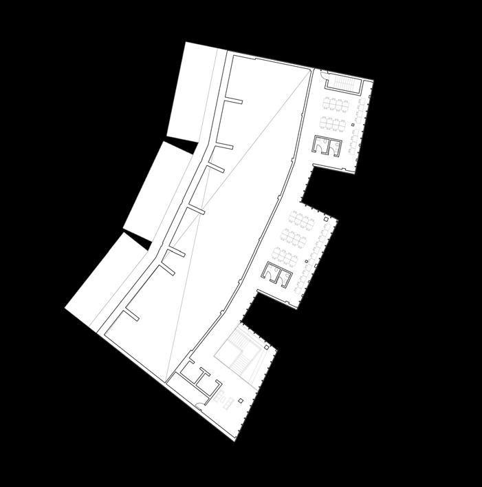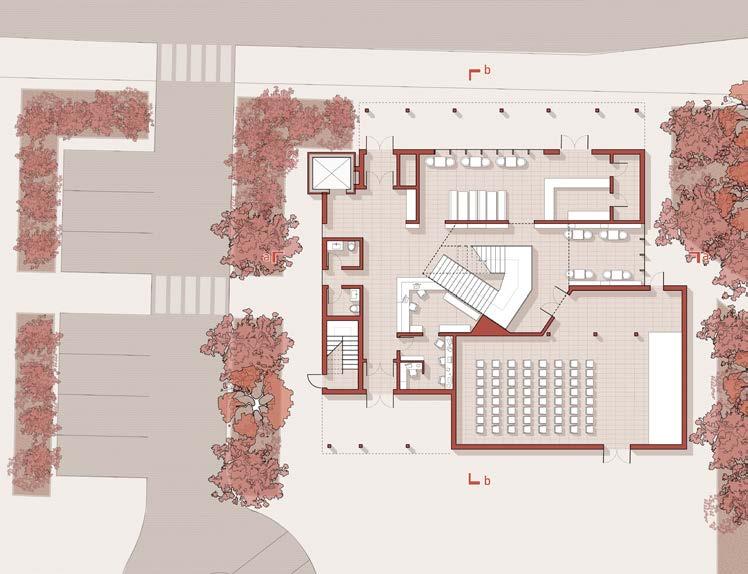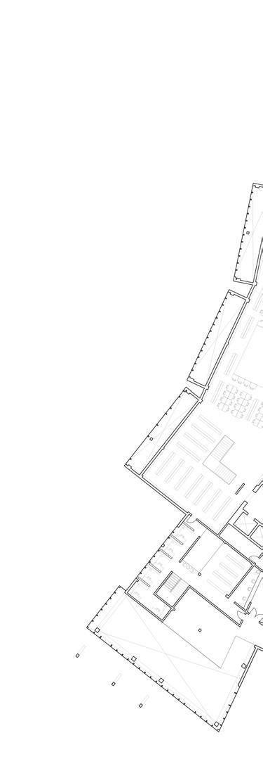 The program of the library is separated distinctly into two floors; The ground floor contains more hightraffic spaces such as the café and auditorium along with two entrance vestibules, while the 2nd floor is reserved for study and reading, among other quiet activities.