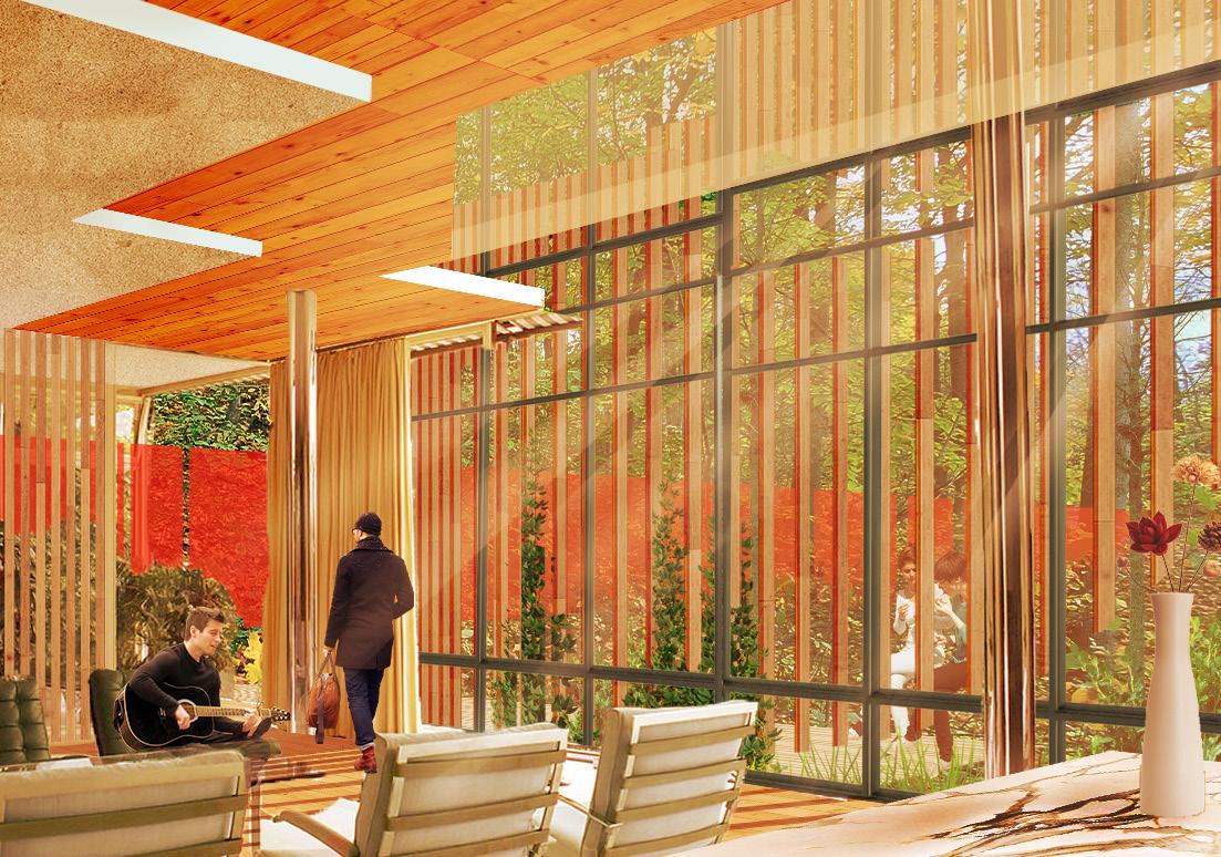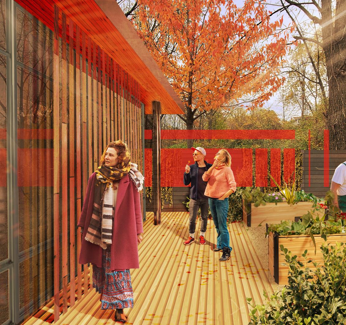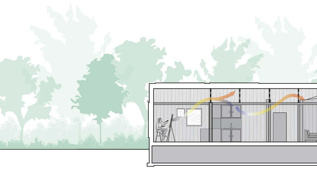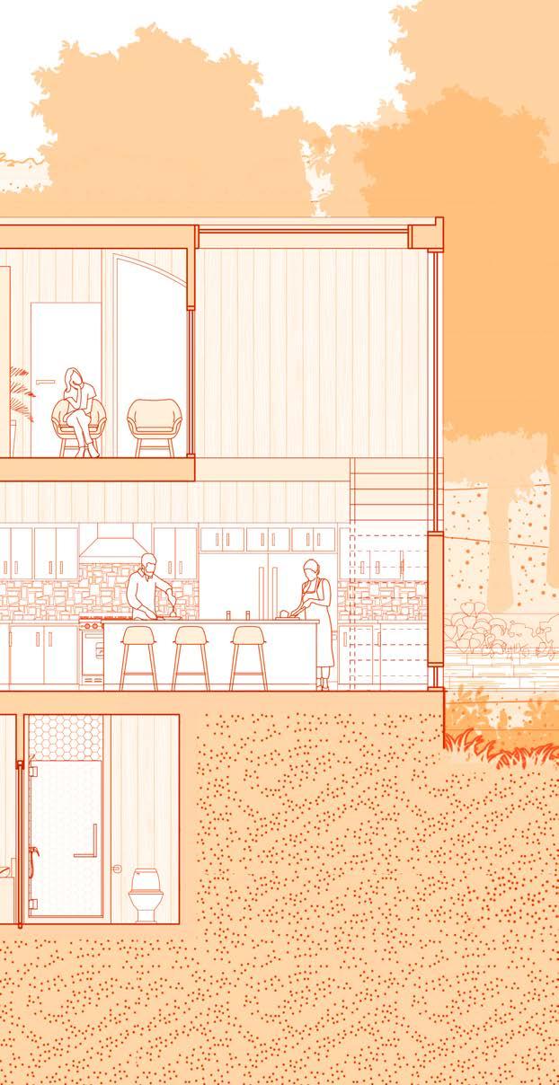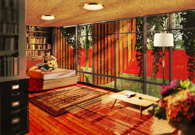The main floor contains a kitchen, living room, pantry, artists studio, two bedrooms, and a shared washroom. Each bedroom also has its own semi-private patio space with vertical wall planters acting as partitions, while also providing each resident with their own personal space to grow small crops.