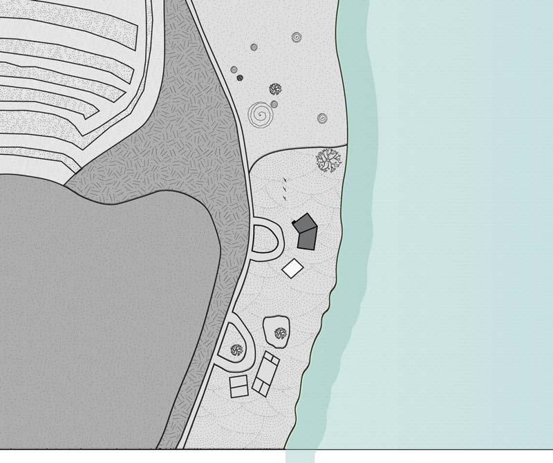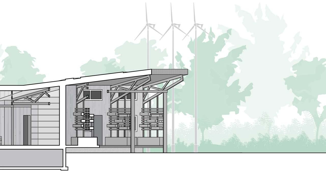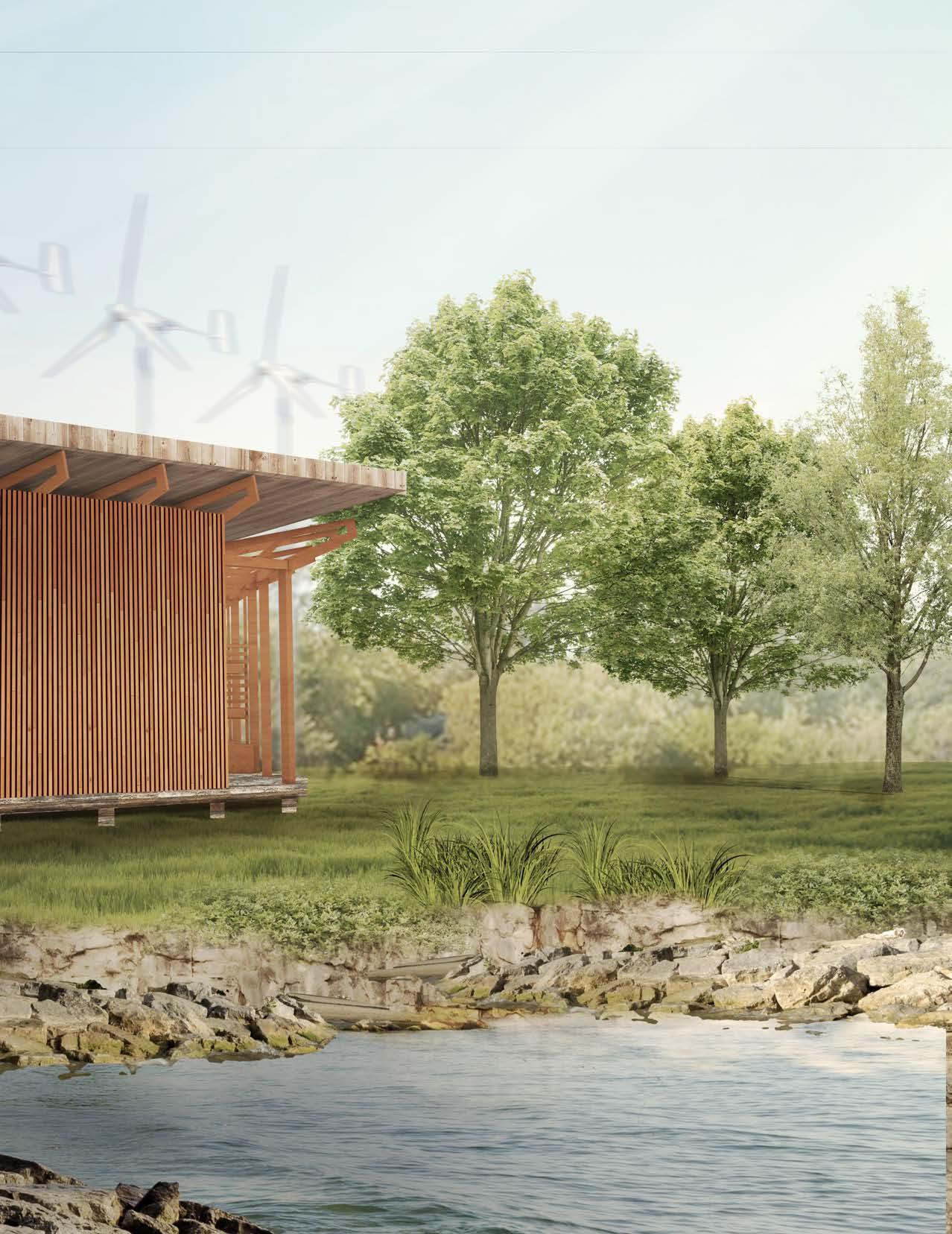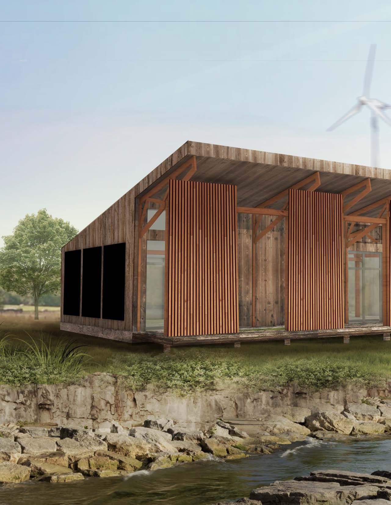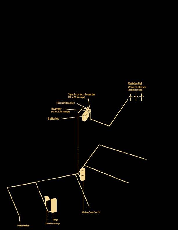 • The coastal location, empty nearby fields, and strong winds make the site an ideal candidate for wind power generation. Therefore, electricity is produced on-site from residential wind turbines and stored in batteries until needed.