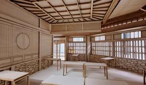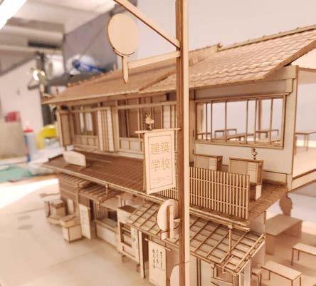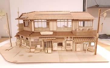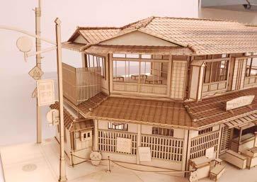A detailed 1:24 replica of a wooden building in Kyoto, currently used as a restaurant. It’s a 2-story corner building with a pitched roof, operable windows, and a fully modeled interior including street furniture and lampposts.