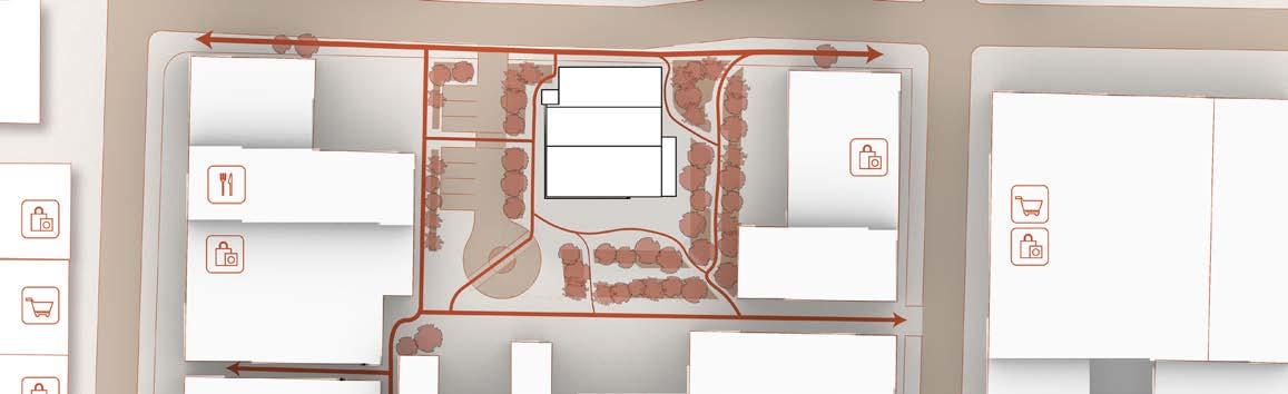 The site’s position in the downtown region puts it near a multitude of shops and services nearby, making it accessible from 4 different directions in addition to access from the main road to the north. Therefore, it became clear that the design of a future library should exist not only as a standalone building, but act as a mediator between these existing pathways and services.
