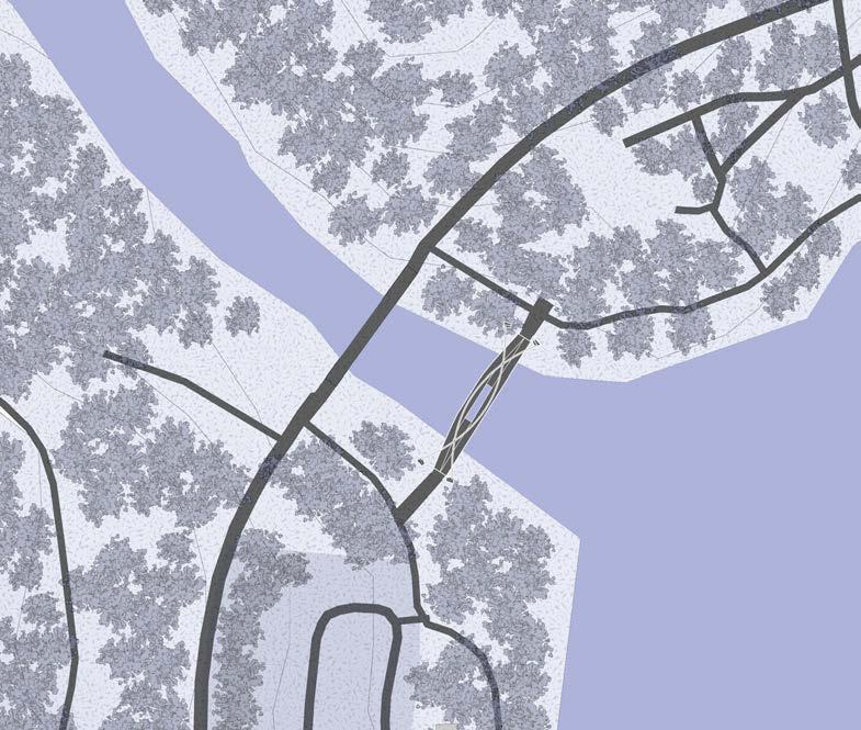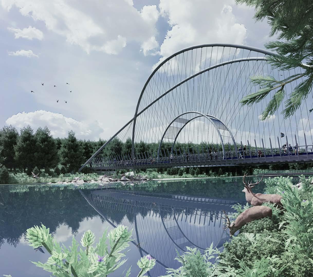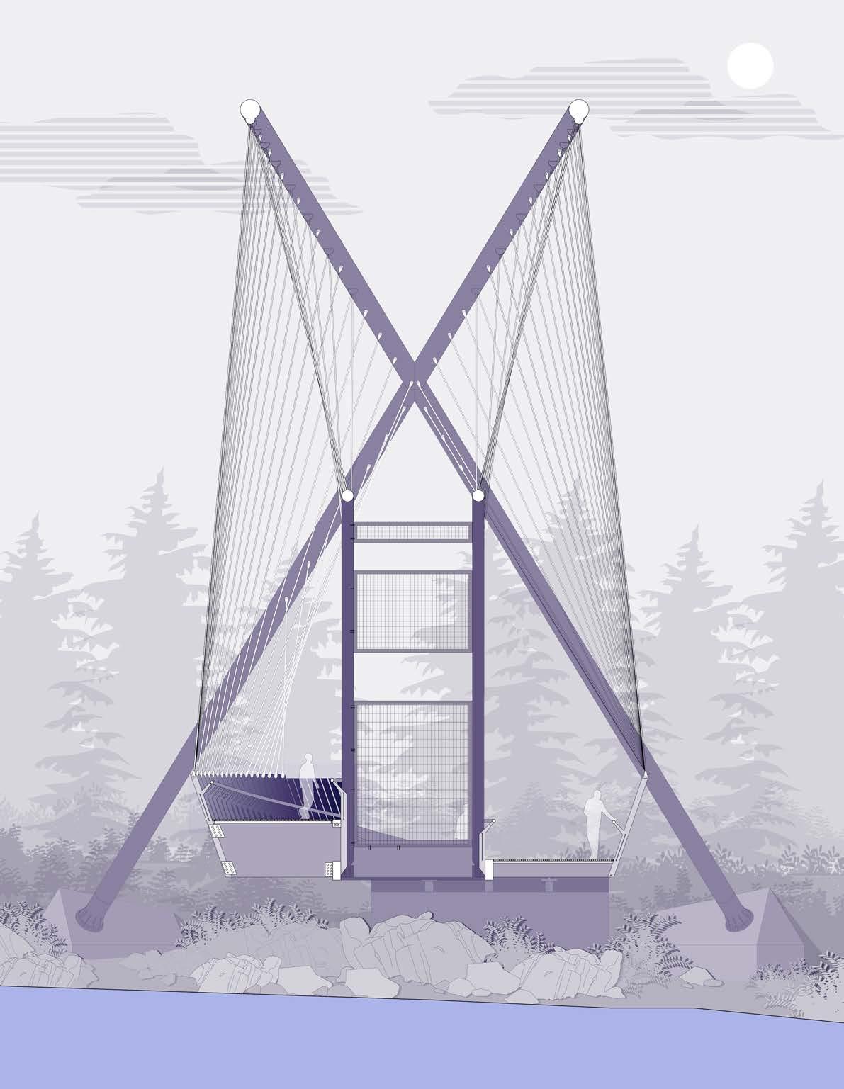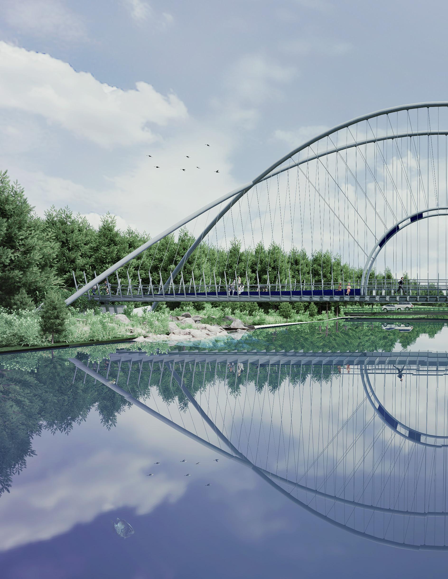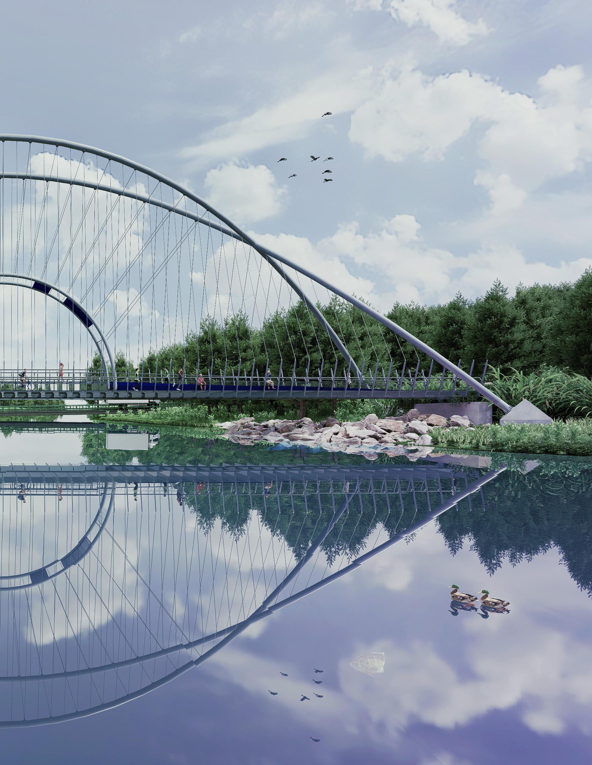 Despite the beauty of the lake and river, the current concrete bridge that exists for people was designed mainly for road traffic and lacks proper pedestrian infrastructure. Therefore, Cerulean Shores is designed to fulfill both needs, to improve pedestrian access between the adjacent hiking trails on opposite sides of the river while also providing a unique crossing experience for its users.