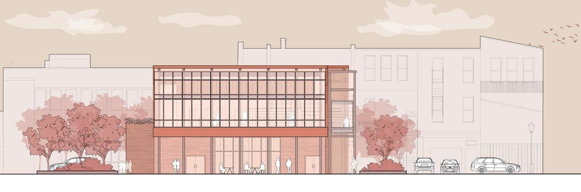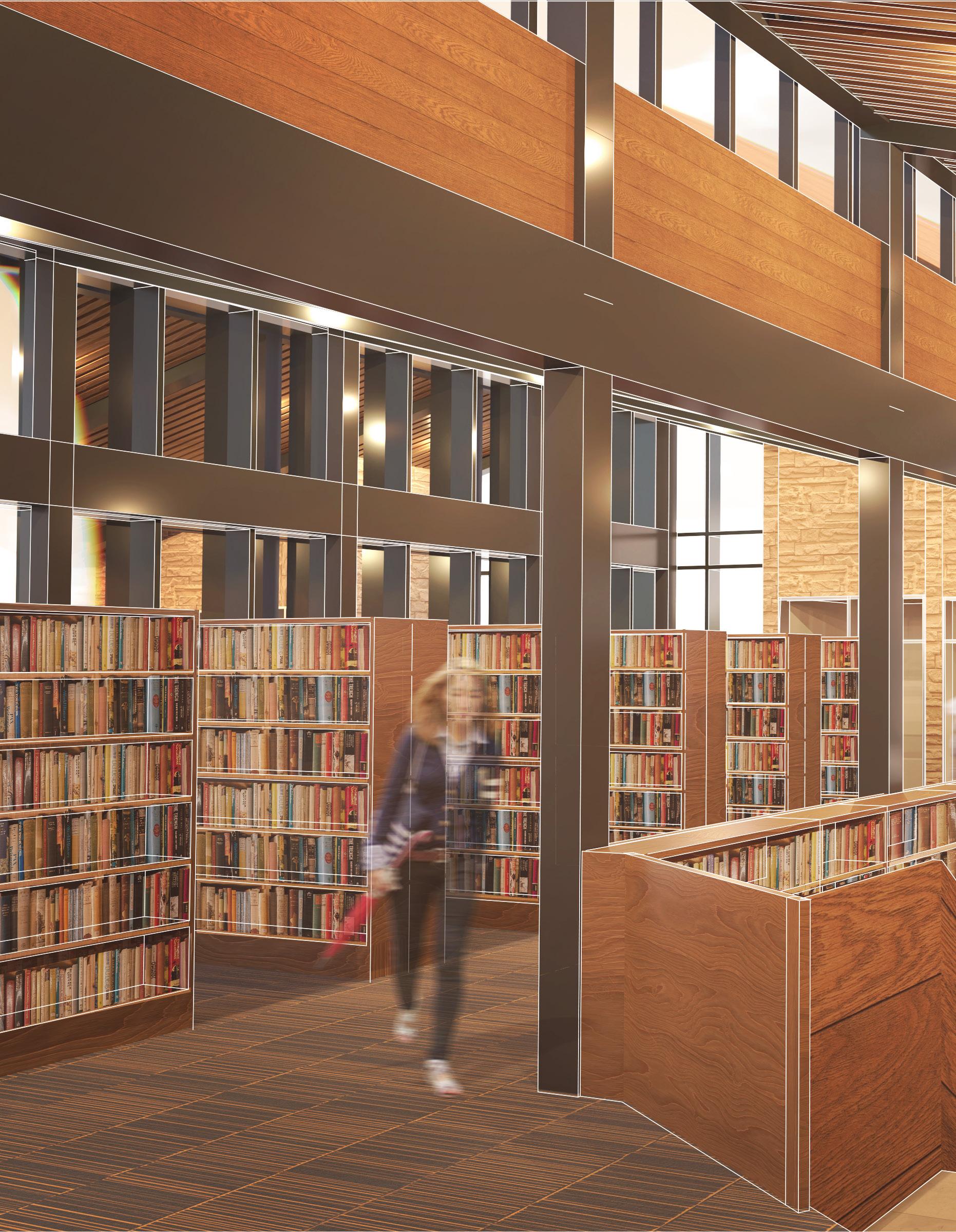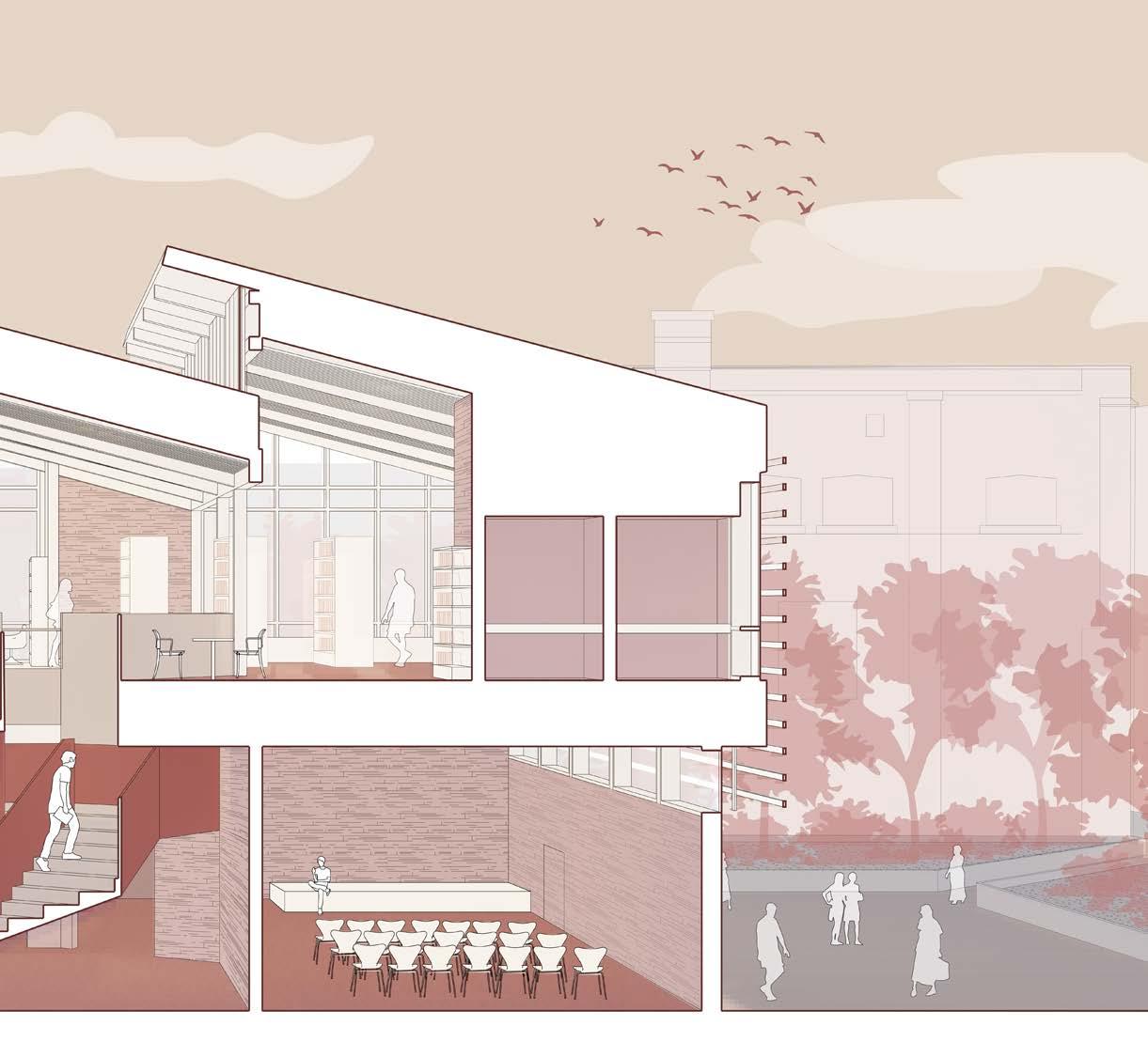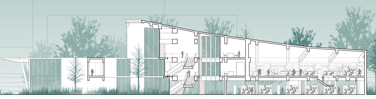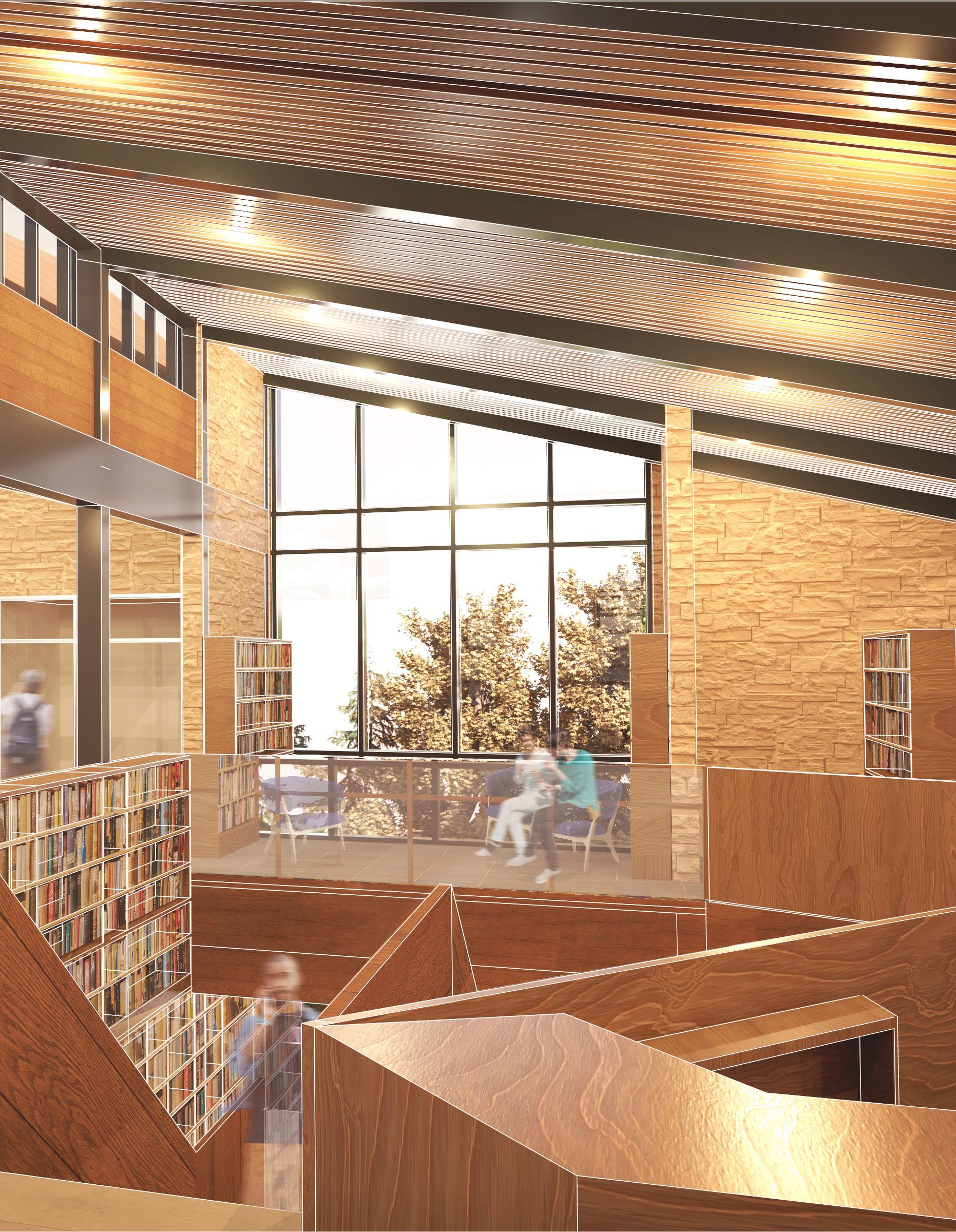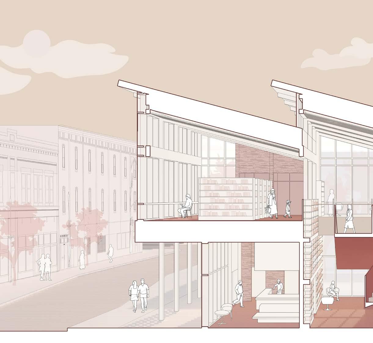 Constructed on an infill parking lot in Cambridge, Ontario, this library is designed to connect the surrounding networks of alleyways and sidewalks while the building itself serves a multitude of programs fit for the contemporary era. The ground floor includes a book cafe and auditorium space that integrates itself with the main lobby, while the library itself is elevated to the 2nd floor, focused on the open space formed in the center of the building and structure provided by the large sawtooth roof and steel framing.