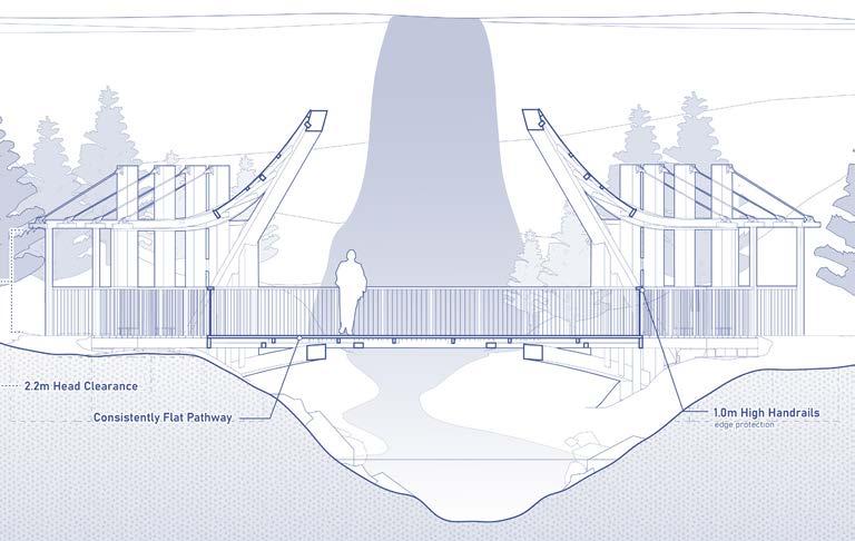 Designed as a replacement for the previous bridge at Sherman Falls, Ontario, the Ribbon Bridge uses large sweeping curves as a representation of the waterfall’s natural flow downstream, while directing the viewer’s gaze across the bridge itself. The main form and structure of the bridge rests on two large glued laminated timber arches designed to suspend the canopy above the deck without blocking viewing angles from either side of the waterfall.
