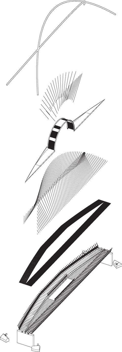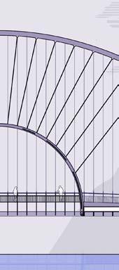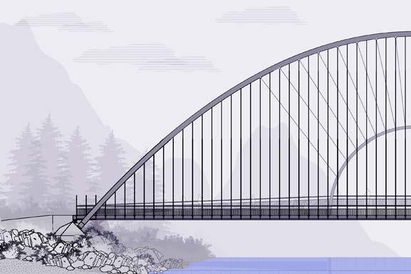 The use of large overhead arches and smaller arches connected to the center of the bridge act as connection points for additional tension cables.
