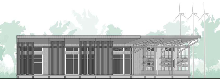 Large overhangs and wooden screens block summer sunlight from entering the east face of the building, preventing additional heat from entering the building while letting in ample amounts of natural sunlight.
