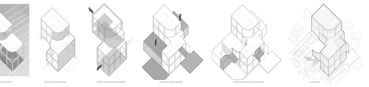 Located at Riverbluffs Park in Cambridge, Ontario, the verticality and angled slope of the site presented an immediate challenge for conventional buildings. This made it clear that creating a multi-story residence with ample fenestration on the east facade would take full advantage of these views provided by the selected site and its topography. To prevent excessive heat gain, wood shading screens were added to select faces of the building, the geometry of which was designed to reflect the geometries present throughout the house.
