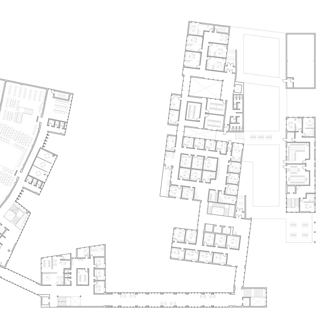 The school is designed to actively engage with both the law students and the wider public/student community thanks to its 3 main courtyards, each with a slightly varying program and function. Should any professor wish to teach outside of the classroom, the library’s 2nd floor is also designed to function as an alternative teaching space given the quiet and contained environment it provides.