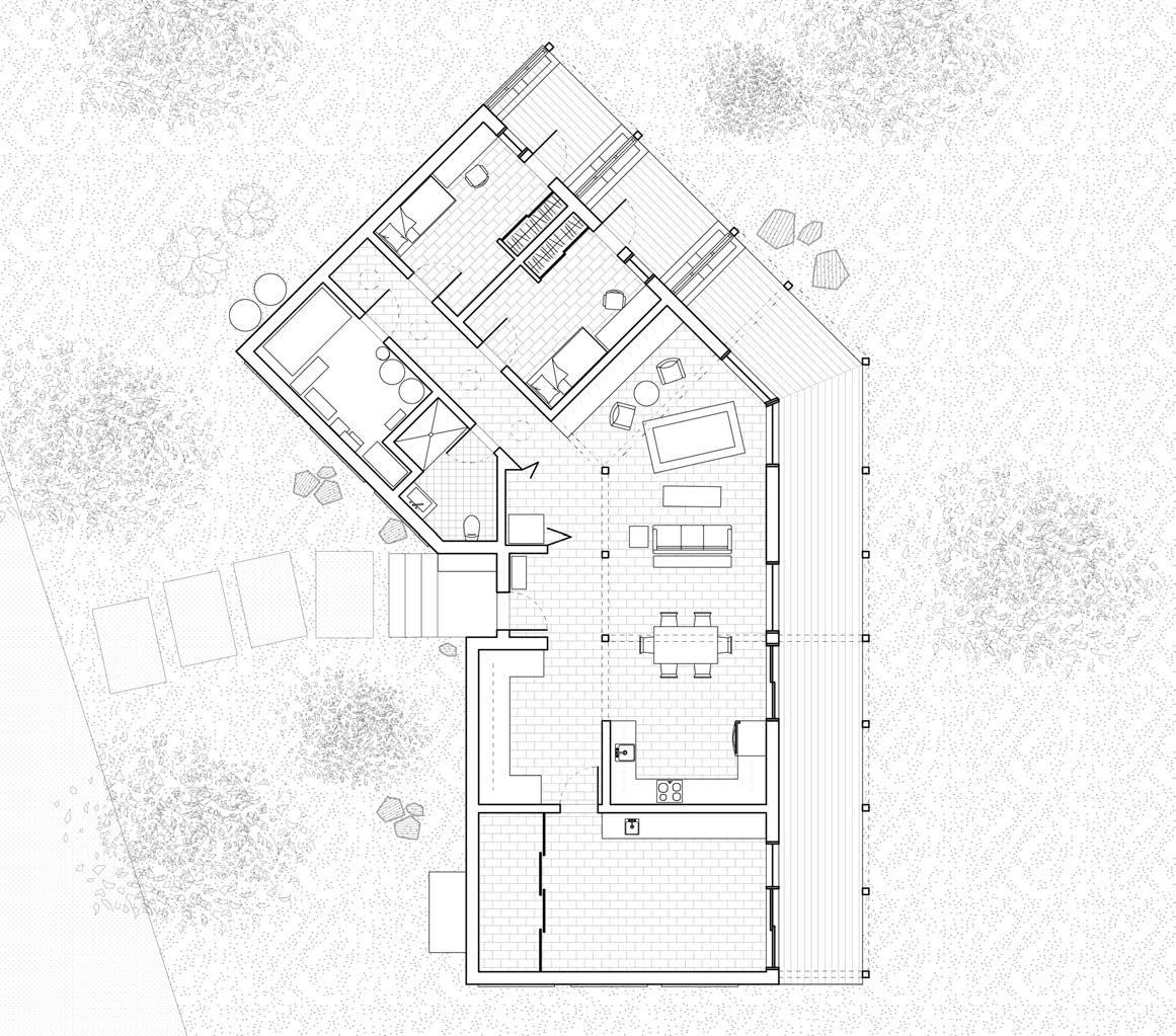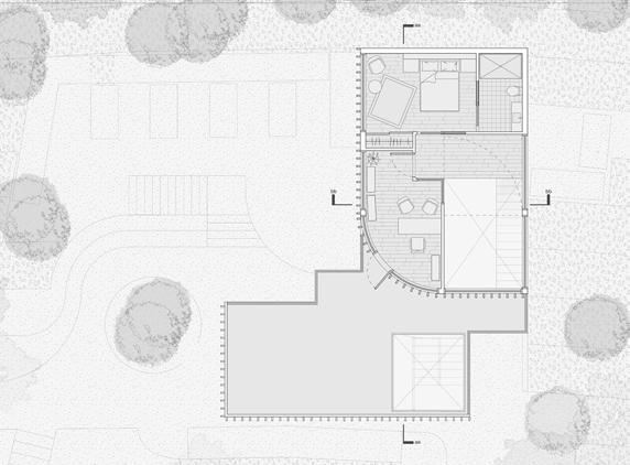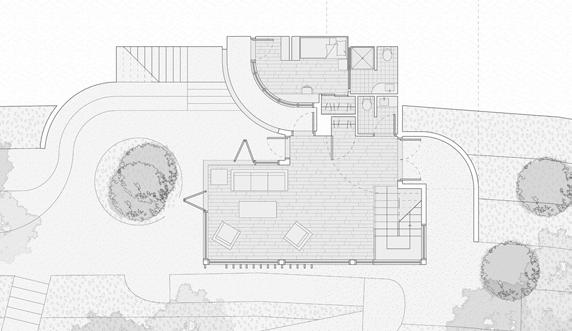 Due to the topography, most of the guest bedroom is embedded into the hill itself to create a cozy feeling while giving the guest more privacy away from the louder and more active parts of the house.