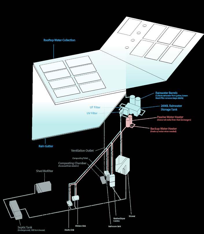 • Once collected, the rainwater is moved to an internal storage tank before undergoing a thorough filtration process. Now clean, the water can be transferred into a passive water heater connected to the solar hot water panels and heat exchangers.