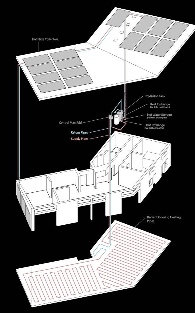 • Radiant floor heating systems, heated using the solar hot water panels, provides efficient heating during the winter compared to conventional HVAC systems.