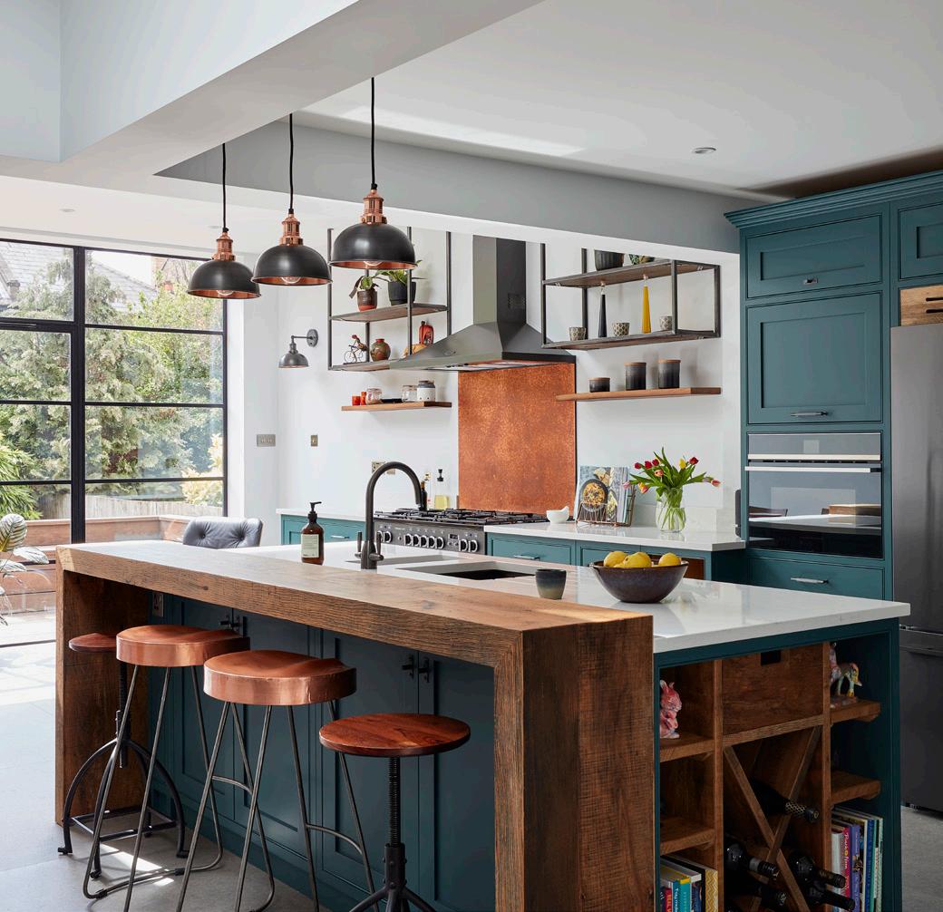 Instantly drawing in the eye is the shakerstyle cabinet run. Painted in Harley Green from Little Greene, this vibrant shade exudes a hint of playfulness and works well with the matt black Crittal doors, white walls and concrete-inspired floor.