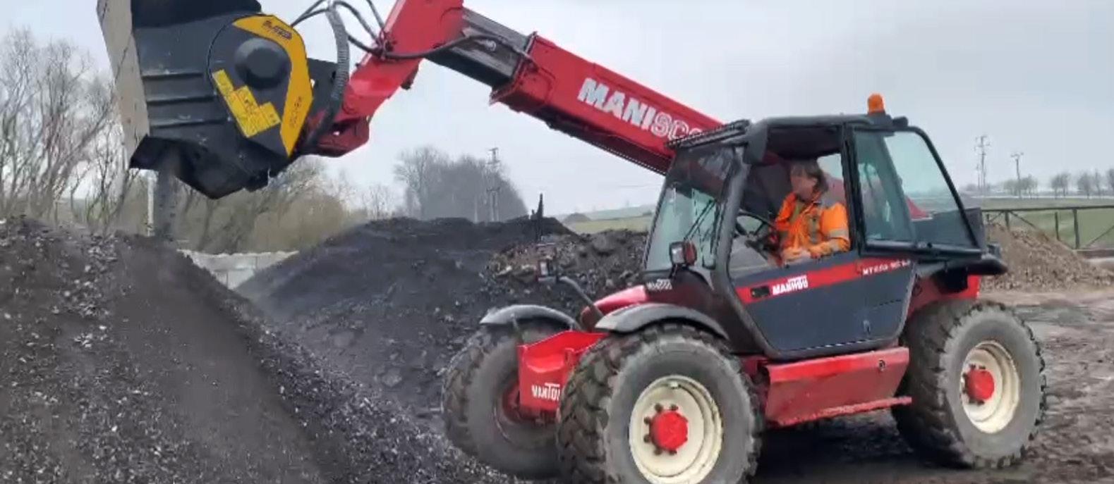 Crusher MB-L200 crusher bucket on its Manitou telehandler, recycled the crushed asphalt, and reused it for road maintenance.