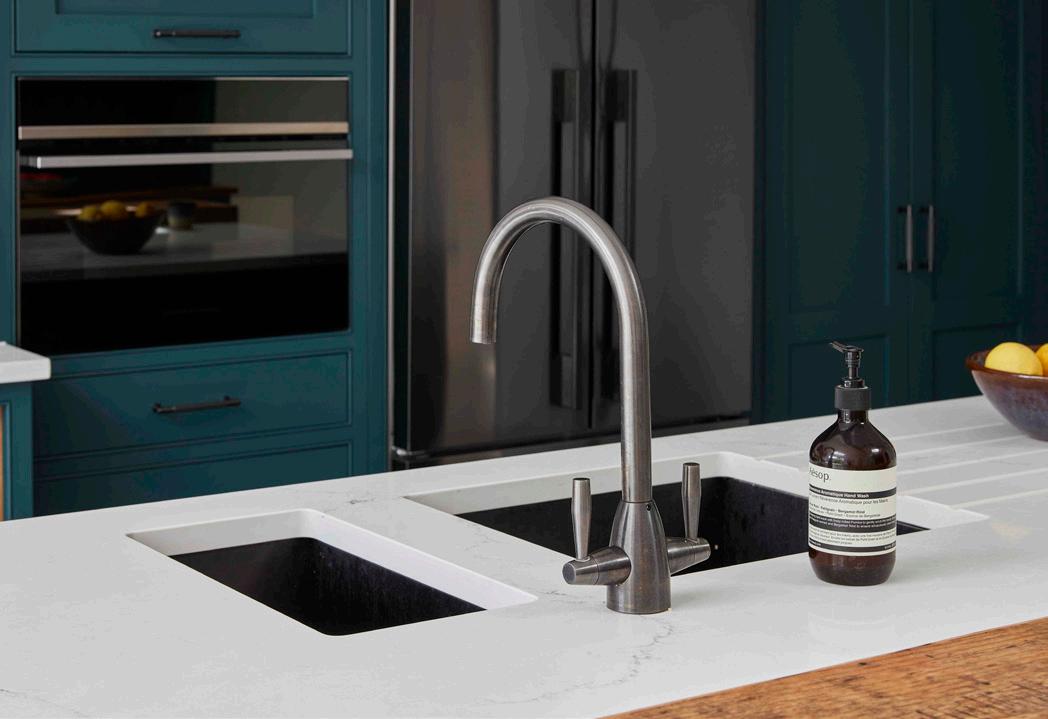 Creating a spacious feeling throughout, the central kitchen island is well placed to offer stunning views into the garden whilst also soaking up the available natural light as it pours into the room. As the homeowners have a young family, this functional kitchen island needed to lend itself to different zones – for example, food preparation, remote working and offering a safe space for children to play whilst their parents are in the room. The introduction of a raised breakfast bar meant that the preparation area is kept separate from the entertaining area – allowing the homeowner to both cook and socialise but with their own dedicated space.