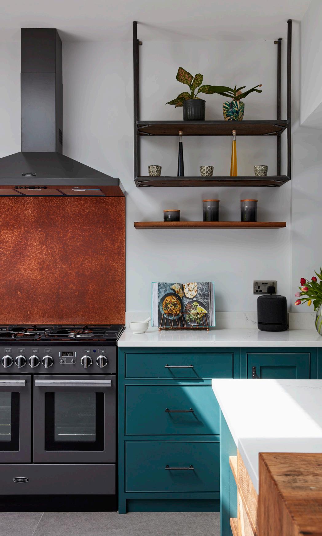 greens and blues being used to modernise the classic kitchen and add depth to more modern schemes. Ultramatt shades of grey and black are the go-to in sophisticated contemporary kitchens whereas deep shades of plum and indigo blue are elevating raw materials like quartz worktops and brass hardware with a strong base colour.