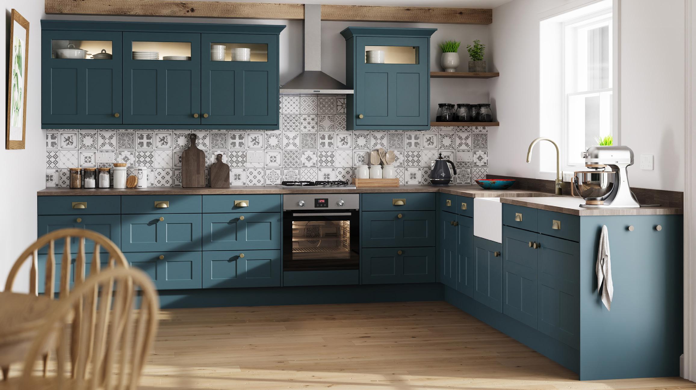 - Below left: New Style - Jayline Supermatt Indigo Blue handleless kitchen with j-profile & full wrap door