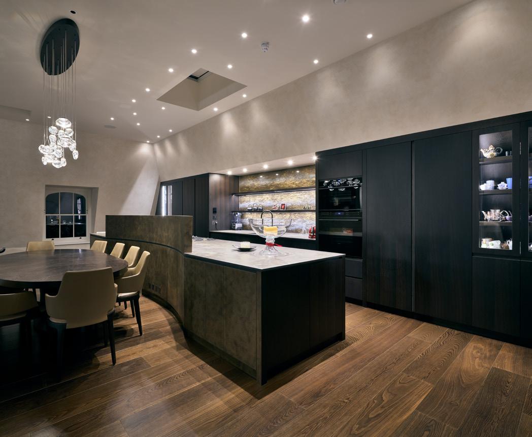 Custom storage is built around the appliances to capitalise on every inch of available space, and the well-defined wet zone with matt black hardware, stone surfaces and ambient lighting help to localise the cook and prep areas. A unique pop-up power solution integrated into the island worktop adds value, creating another access point to plug in small appliances when baking or preparing a large meal.