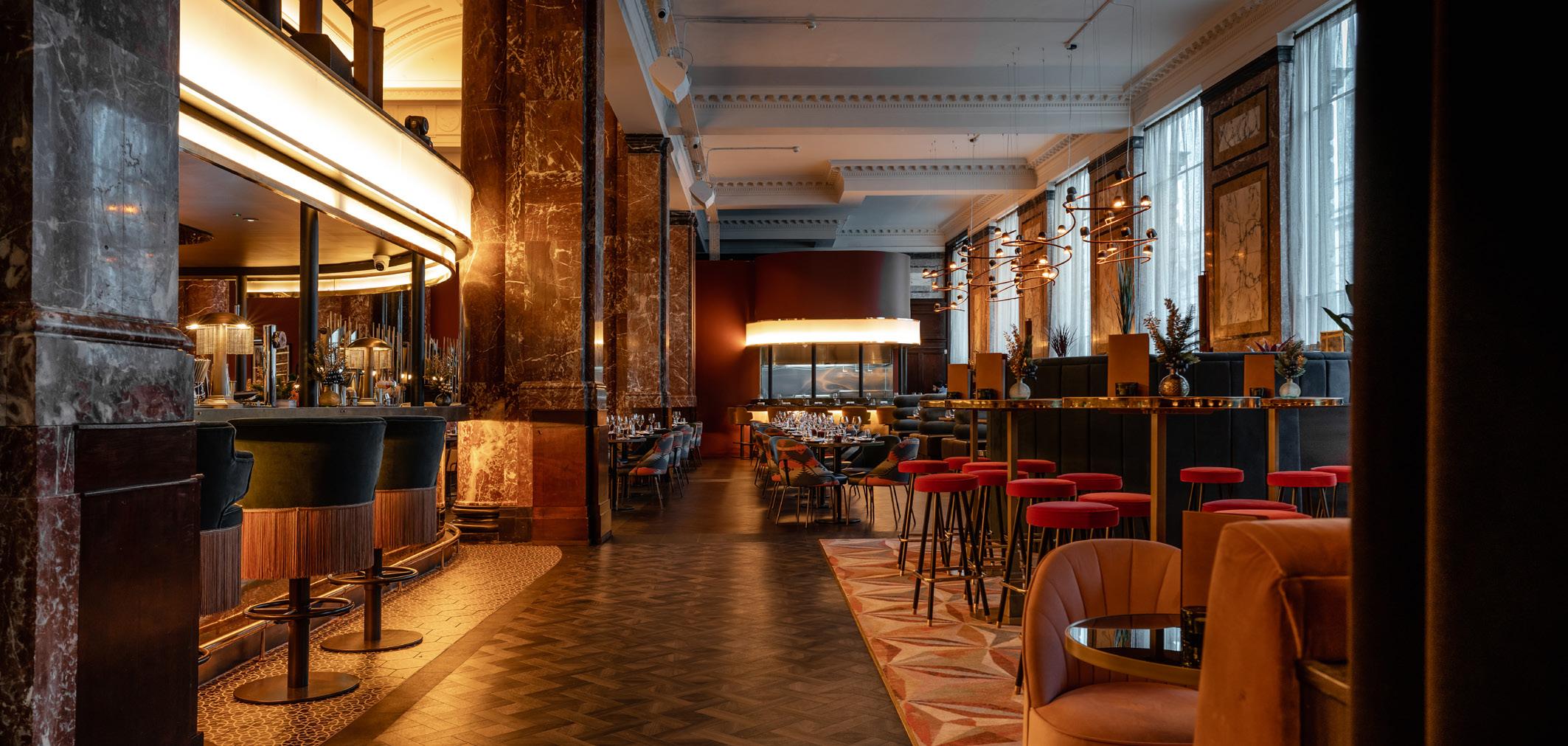 As you arrive at Gaucho Liverpool, you’ll be greeted by the two famous tiger heads on the exterior doors, said to bring good luck to those who rub the teeth of the figures. Inside, the design takes inspiration from the passion-fuelled tango clubs that bring the streets of Buenos Aires to life each night, with touches of faded glamour and layering of South American details throughout. Statement features further lend to the drama, with a central island bar, striking burnt orange marble pillars, and high ceilings with intricate detailing. A warm colour palette of reds, oranges, and earthy tones is offset with touches of gold detailing and pops of foliage, with an inviting yet exclusive feel.