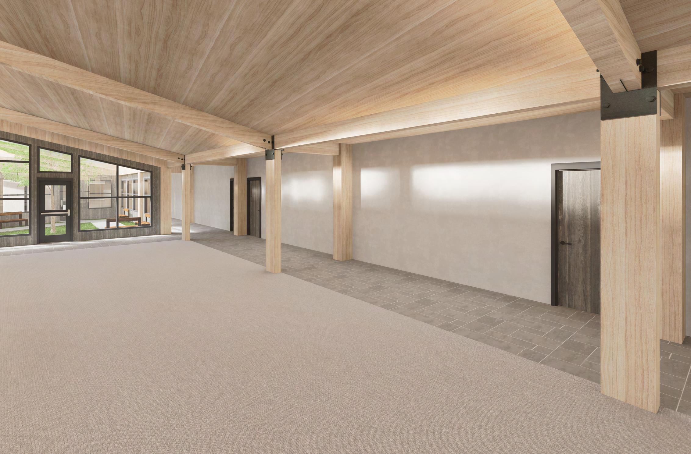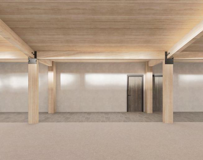 Exposed Heavy timber beams and columns help achieve both structural and sustainable goals. Using timber for structural elements helps drastically reduce its carbon footprint while creating an aesthetically pleasing and biophilic conscious environment that can be experienced by residents and visitors.