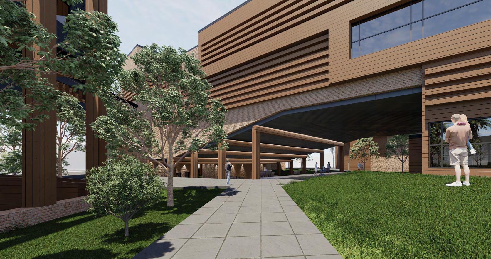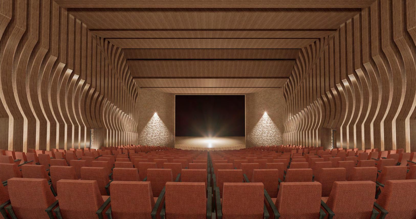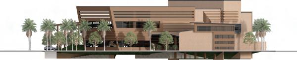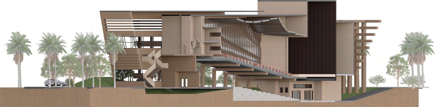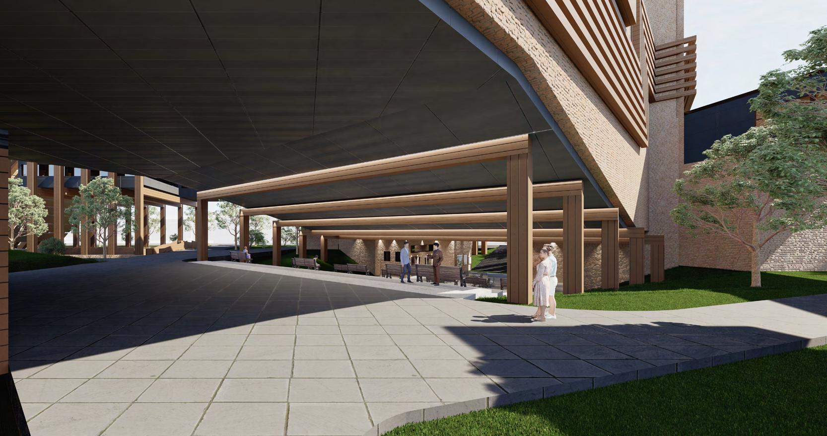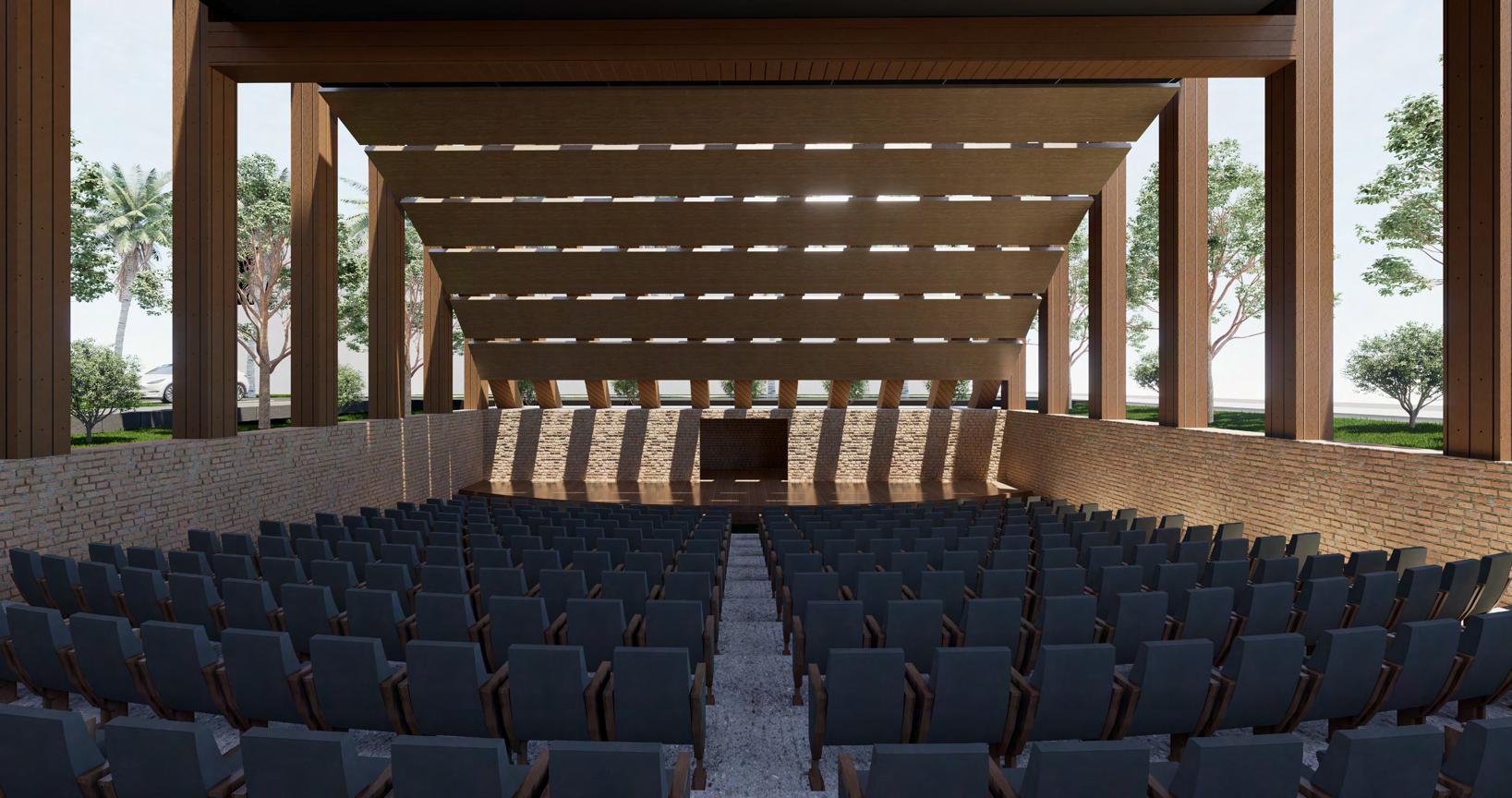 The Perspicere Performing Arts Center captivates and engages the community with three unique story paths. Semi-opaque glass walls offer glimpses of behind-the-scenes preparations, sparking curiosity. The center's materiality blends traditional brick with modern wooden paneling, symbolizing the fusion of past and present storytelling. The central concept is framing a view, drawing audience focus. The main entry on Al Harris and Orange St. features a monumental wooden structure, guiding visitors to the gallery and café. Here, guests experience the space from a performer's perspective. The landscape design continues this framing theme, directing visitors to specific theater spaces like the amphitheater and proscenium. This design encourages full immersion in storytelling, making the Perspicere Performing Arts Center a dynamic, memorable venue.