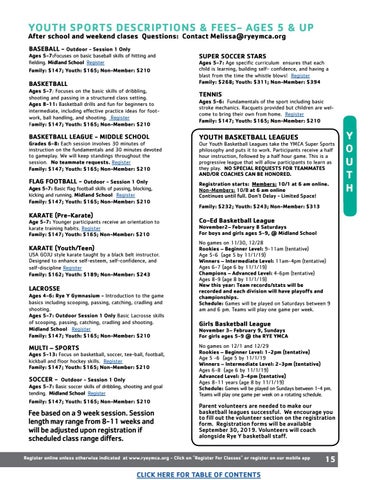 YOUTH SPORTS DESCRIPTIONS & FEES- AGES 5 & UP After school and weekend clases Questions: Contact Melissa@ryeymca.org BASEBALL - Outdoor - Session 1 Only Ages 5-7:Focuses on basic baseball skills of hitting and fielding. Midland School Register Family: $147; Youth: $165; Non-Member: $210 BASKETBALL