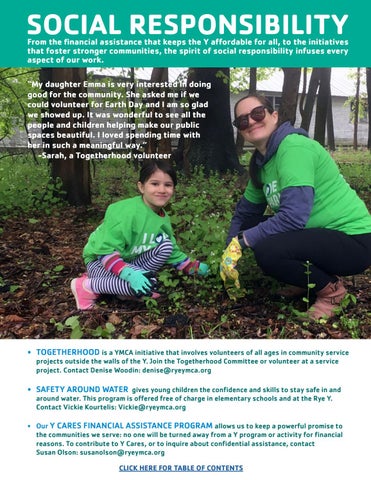 SOCIAL RESPONSIBILITY From the financial assistance that keeps the Y affordable for all, to the initiatives that foster stronger communities, the spirit of social responsibility infuses every aspect of our work. “My daughter Emma is very interested in doing good for the community. She asked me if we could volunteer for Earth Day and I am so glad we showed up. It was wonderful to see all the people and children helping make our public spaces beautiful. I loved spending time with her in such a meaningful way.” -Sarah, a Togetherhood volunteer