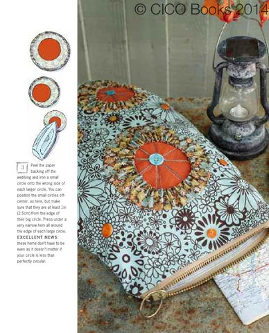 Peel the paper backing off the webbing and iron a small circle onto the wrong side of each larger circle. You can position the small circles offcenter, as here, but make sure that they are at least 1in (2.5cm) from the edge of their big circle. Press under a very narrow hem all around the edge of each large circle. : these hems don’t have to be even as it doesn’t matter if your circle is less than perfectly circular.