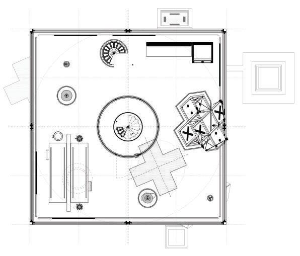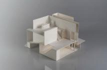 The Ghent House project began with a series of short animation-sketches made in the Maya platform. The sketches inspired the graphic stamps, decals, and object-scatters that move through the floor plates and through the building’s envelope. The project relates to the other houses in the series in that it retains a cubic massing strategy, while introducing three dimensional rotations and more chance-based interruptions/intersections in plan and section. A key geometric precedent for the house is the late-career John Hejduk’s project Cathedral. Like the mute rectangular prism of Cathedral, the glass cubic-envelope in the Ghent House functions as a passive visual frame for the interior life of the color fields, furniture, and objects it houses.