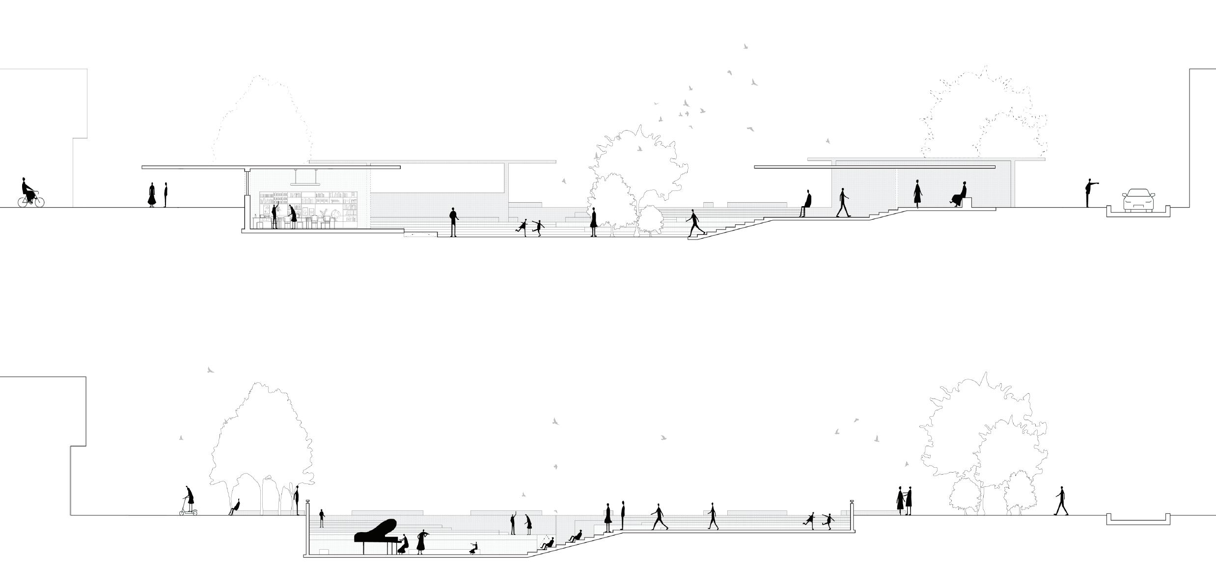 open-view circulation paths connecting multiple floors and sub-levels. These pathways merge seamlessly in different directions, enhancing the ease of movement and inviting continuous exploration of the structure.