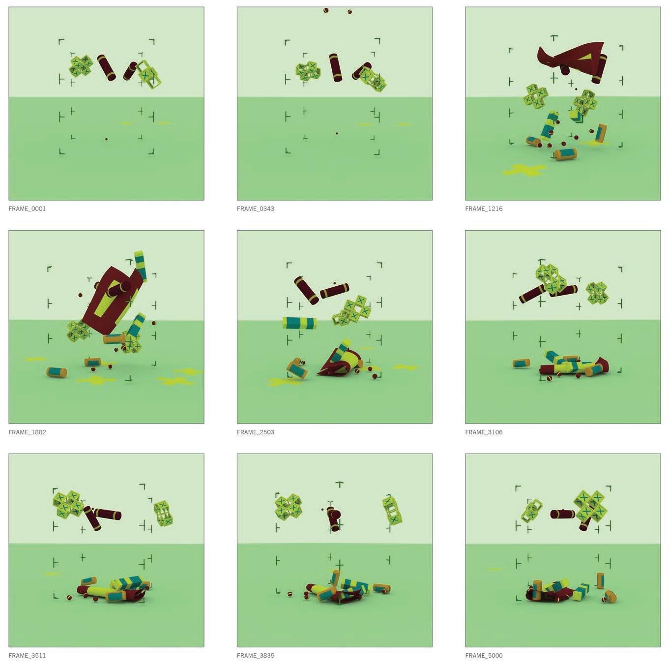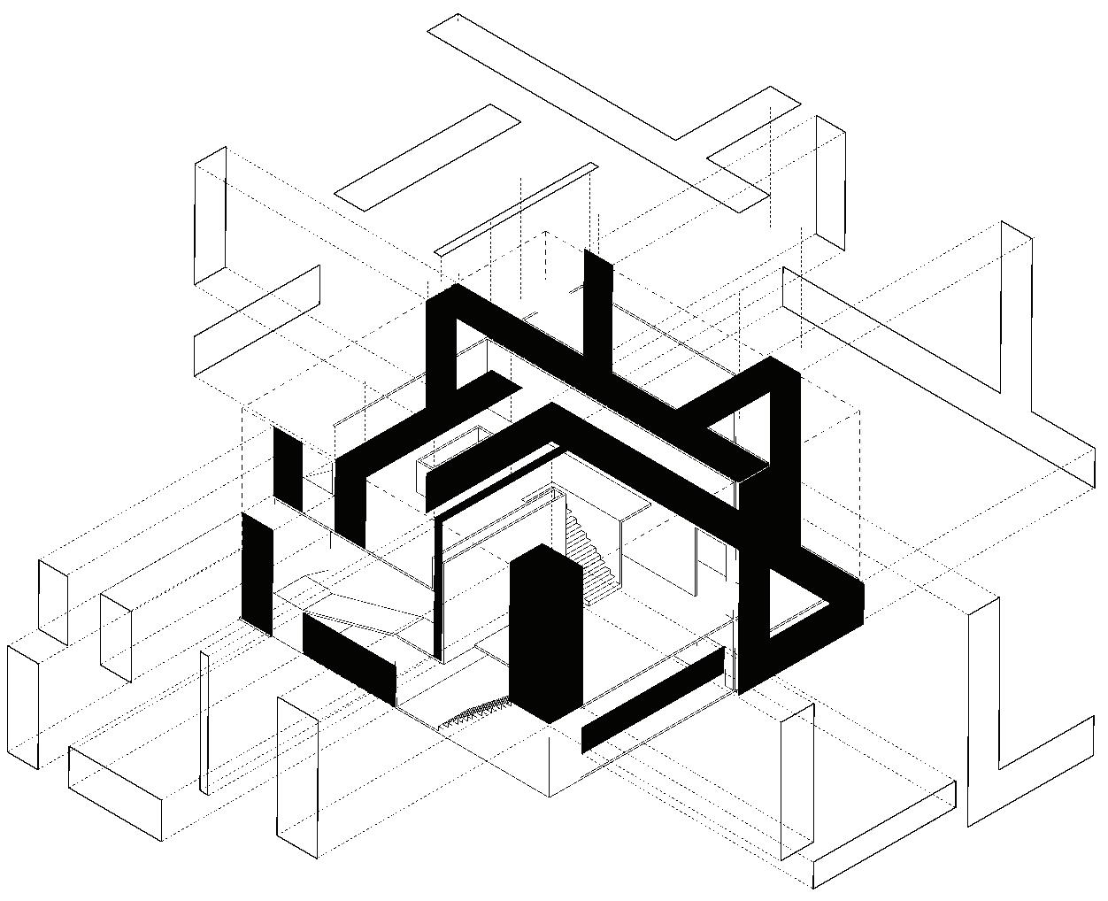 The Ghent House project began with a series of short animation-sketches made in the Maya platform. The sketches inspired the graphic stamps, decals, and object-scatters that move through the floor plates and through the building’s envelope. The project relates to the other houses in the series in that it retains a cubic massing strategy, while introducing three dimensional rotations and more chance-based interruptions/intersections in plan and section. A key geometric precedent for the house is the late-career John Hejduk’s project Cathedral. Like the mute rectangular prism of Cathedral, the glass cubic-envelope in the Ghent House functions as a passive visual frame for the interior life of the color fields, furniture, and objects it houses.