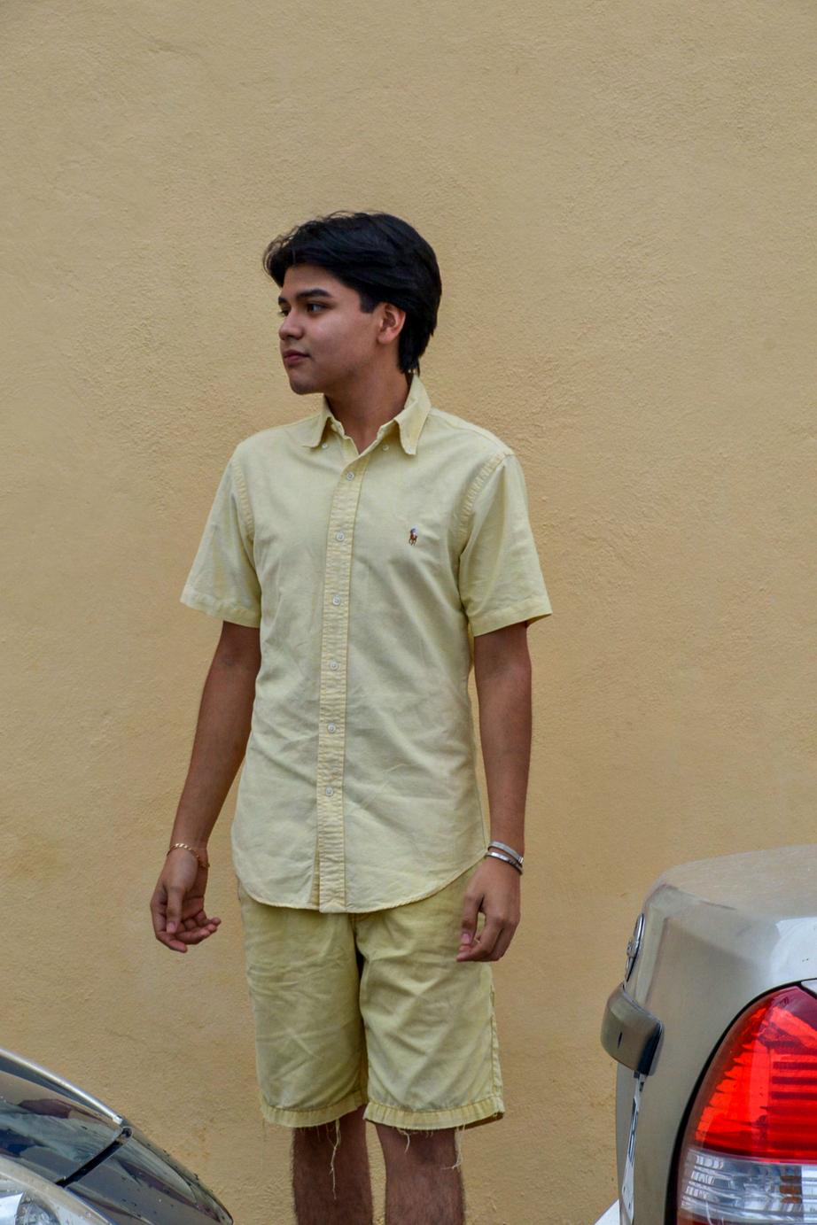 Viste una camisa tipo polo de manga corta de la misma paleta de color, lo cual crea una armonía visual con el fondo. Su expresión es serena, y su posturarelajada.