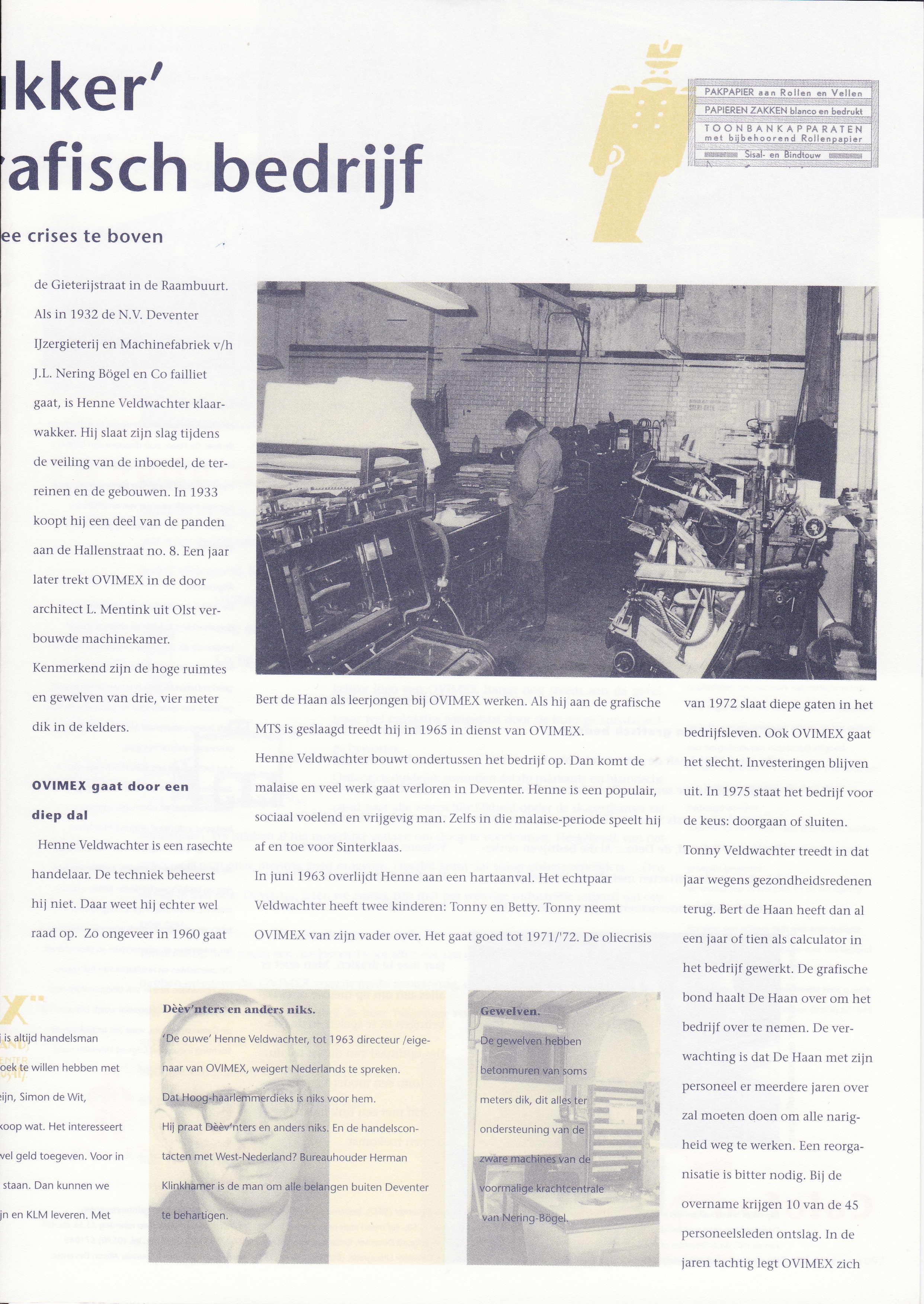 BertdeHaanalsleerjongenbii OVIMEXwerken.Alshij aandegrafische MTSisgeslaagdtreedthij in 1965in dienstvan OVIMEX. HenneVeldwachterbouwt ondertussenhet bedÍiif op. Dan kon-rtde malaiseen veelwerk gaatverlotenin Deventer.Henneis eenpopulair, sociaalvoelenden vrijgevigrnan.Zelfsin diemalaise-periodespeelthij afcn toevoor Sinterklaas.