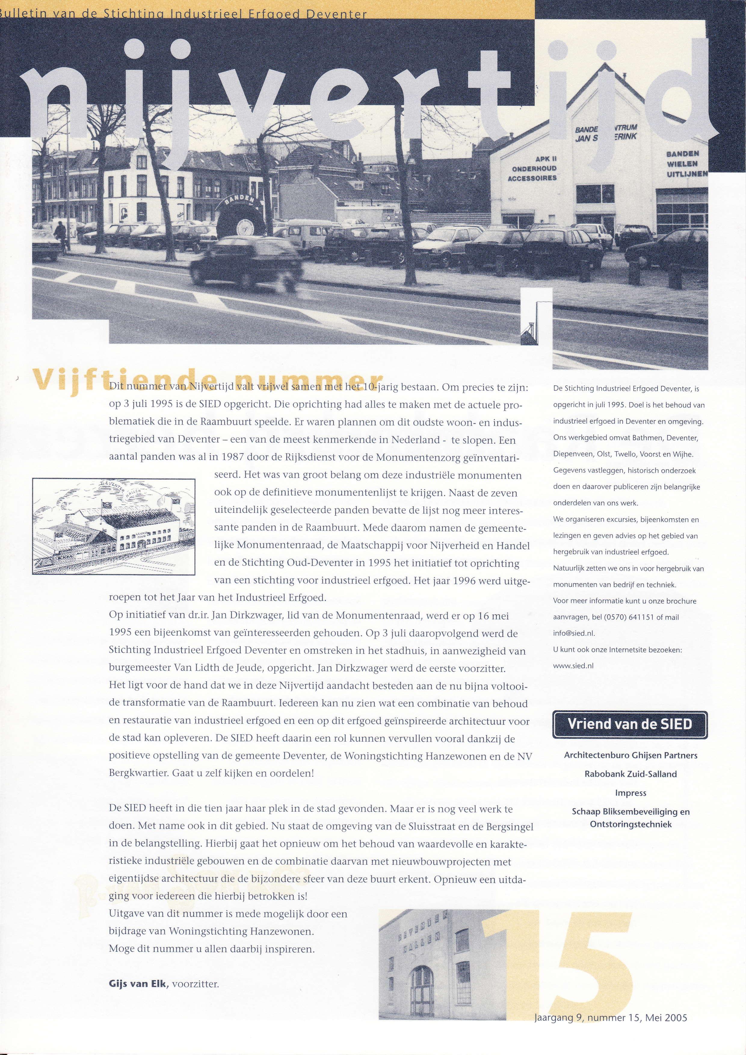 Dit nurnmervan Niivertijdvaltvriin'e1samenmet het 10-jarigbestaan.Om preciestc zijn op ,3juli 1995isdeSIEDopgcricht.Dieoprichtir-rghadalleste makenmet deactueleproblematiekdiein deRaambuurtspeelde.L,r'rvarenplannenom dit oudstewoon-enindustriegebiedvan Deventer- eenvan derneestkenrnerkenclein Nedcrland- te slopen.Een aantalpandenwasal in 1987door deI{ijksctienstr.oorde MonLrmentenzorggeïnventariseerd.Hct wasvan grootbelangom dezeindustriëlemonumenten ookop dedefinitievemonumentenlijsttekrijgen.Naastdezeven uiteindelijkgeselecteerdepandenbevattedelijstr-rogmeerinteressantepandenin de Raambuurt.Mededaaromnamen degemeentelijkeMonumentenraad,deMaatschappijvoorNijrrerheiden Hanclel en deStichtingOud-l)eventerir.r1995het initiatief tot oprichting van eenstichtingvoor industrieelertgoed.Hetjaar1996r,r'erduitÉleroepentot hetIaaÍvan het IndustrieelErfgoed. Op initiatief van dr.ir._fan Dirkzrn'ager,lid van deMonumentenraacl,werder.op l6 mei 1995eenbijeenkomstvan geïnteresseerdengehouden.Op 3 juli daaropvolgendwerdde StichtingIndustrieelErfgoedDeventeren omstrekenin het stadhuis,in aanwezigheidvan burgerneesterVan Lidth deJeude,opgericht..]anDirkzwagerwerd deecrstevooÍzitter.. Hetligt voordehanddatwein dezeNijvertijdaandachtbestedenaandenu bijnavoltooidetransformatievan deRaambuurt.ieclereenkan nu zienwat eencombinatievan behoud en restauratievan industrieelerfgoeden eenop dit erfgoedgeïnspireerdearchitectuurvoor clestadkan opleveren.DeSIEDheell daarineenrol kunnen vervullenvooral dankziide positleveopstellingvan degemeentel)eventer,deWoningstichting Hanzewonenen deNV Bergkwartier.Gaatu zelfkijkenen oordelen!