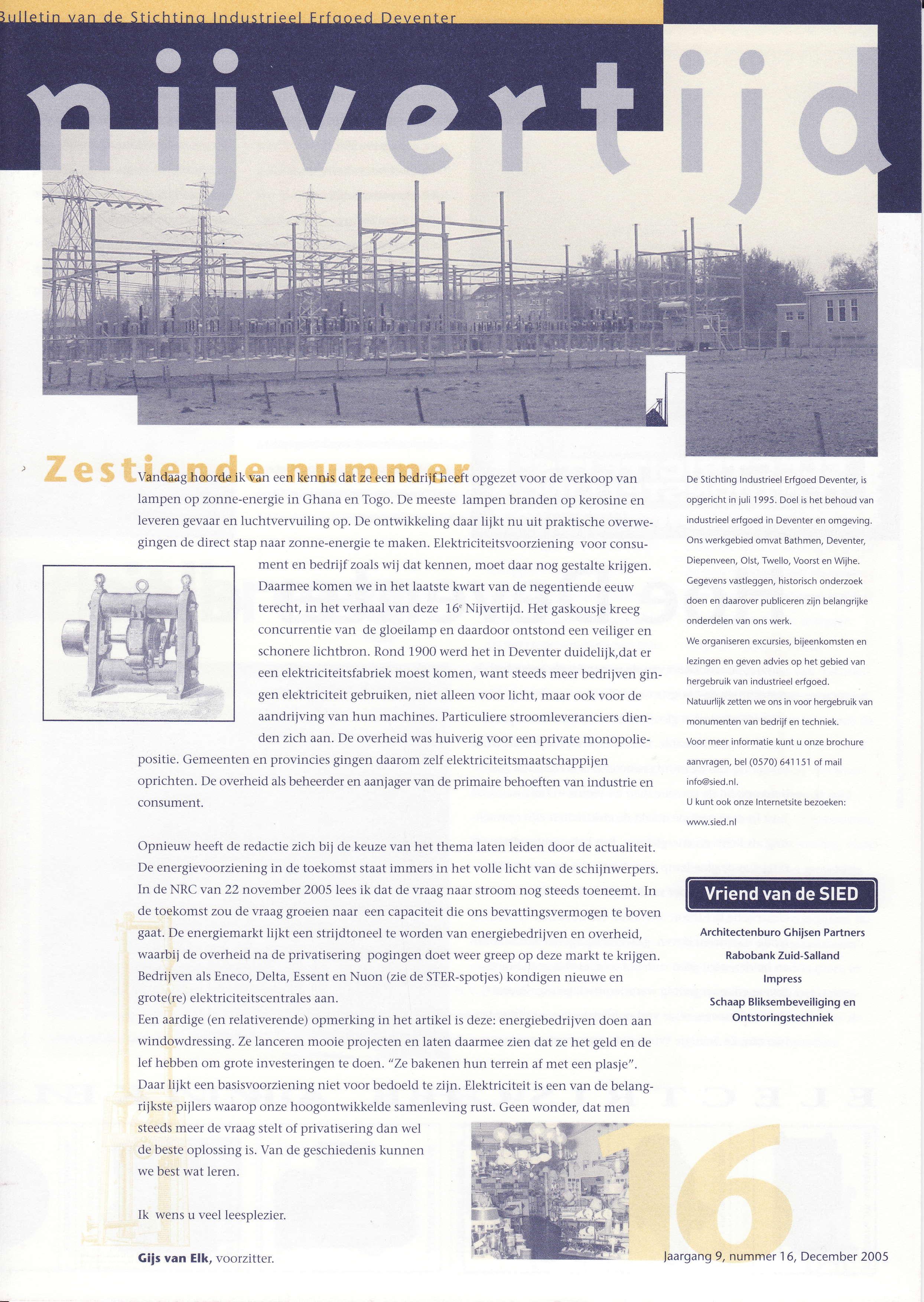 Vandaaghoordeik van eenkennisdatzeeenbedrijf heeft opgezetvoor deverkoopvan lampen op zonne-energiein Ghanaen Togo.Demeestelampen brandenop kerosineen leverengevaaren luchtvervuiling op. Deontwikkeling daarlijkt nu uit praktischeoverwegingendedirectstapnaarzonne-energiete maken.Elektriciteitsvoorzieningvoor consument en bedrijfzoalswii dat kennen,moet daarnog gestaltekrijgen. Daarmeekomen we in het laatstekwart van denegentiendeeeuw terecht,in het verhaalvan deze 16"Nijvertijd. Het gaskousjekreeg concurrentievan degloeilampen daardooÍontstond eenveiligeren schonereiichtbron. Rond 1900werd het in DeventeÍduideiijk,dater eenelektriciteitsfabriekmoestkomen,want steedsmeerbedrijvengin genelektriciteitgebruiken,niet alleenvoor licht, maarook voor de aandrijvingvan hun machines.Particulierestroomleveranciersdienden zlch aan.Deoverheidwashuiverigvoor eenprivatemonopoliepositie.Gemeentenen provinciesgingendaaromzelfelektriciteitsmaatschappijen oprichten.Deoverheidalsbeheerderenaanjagervan deprimairebehoeftenvan industrieen consument.