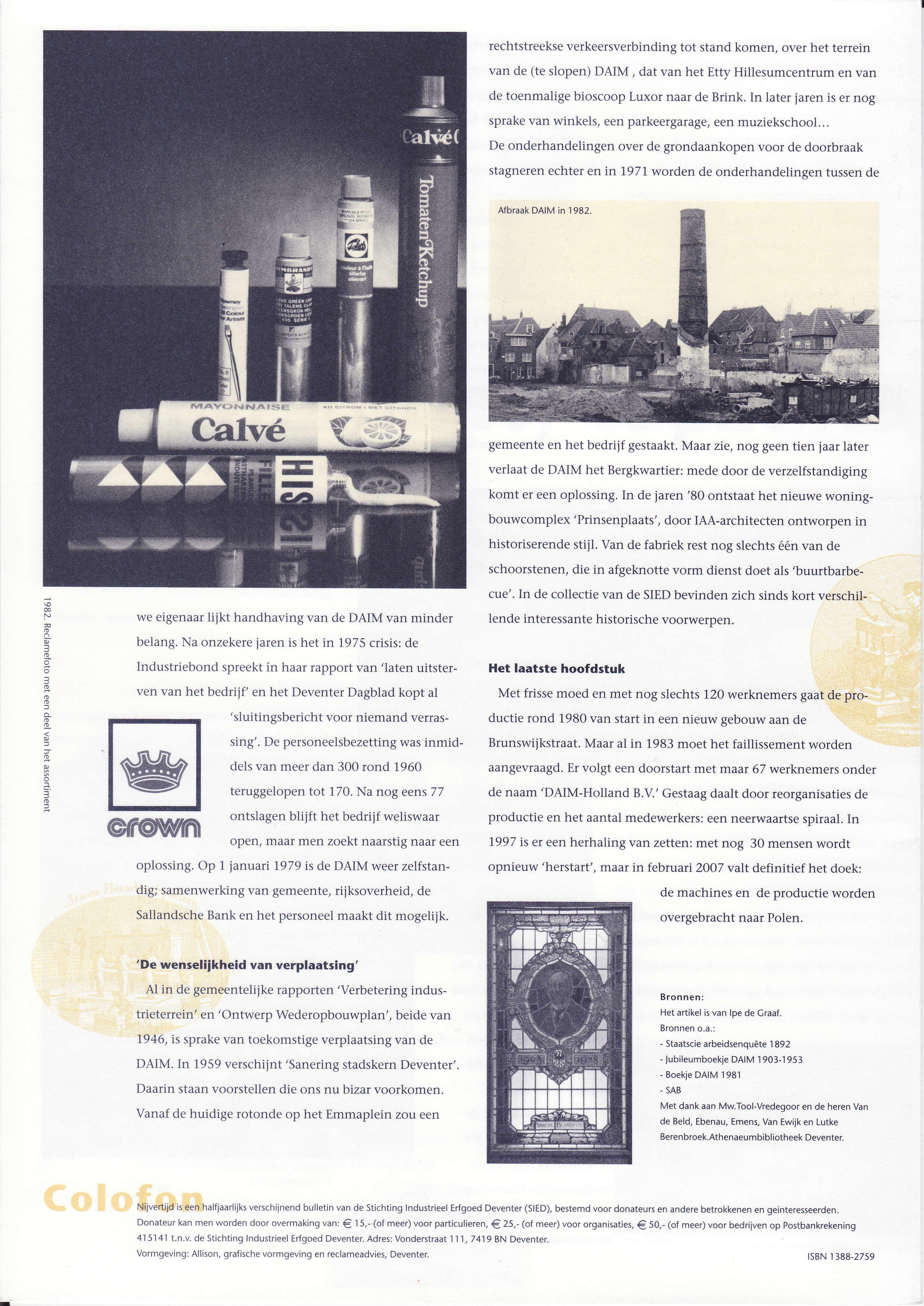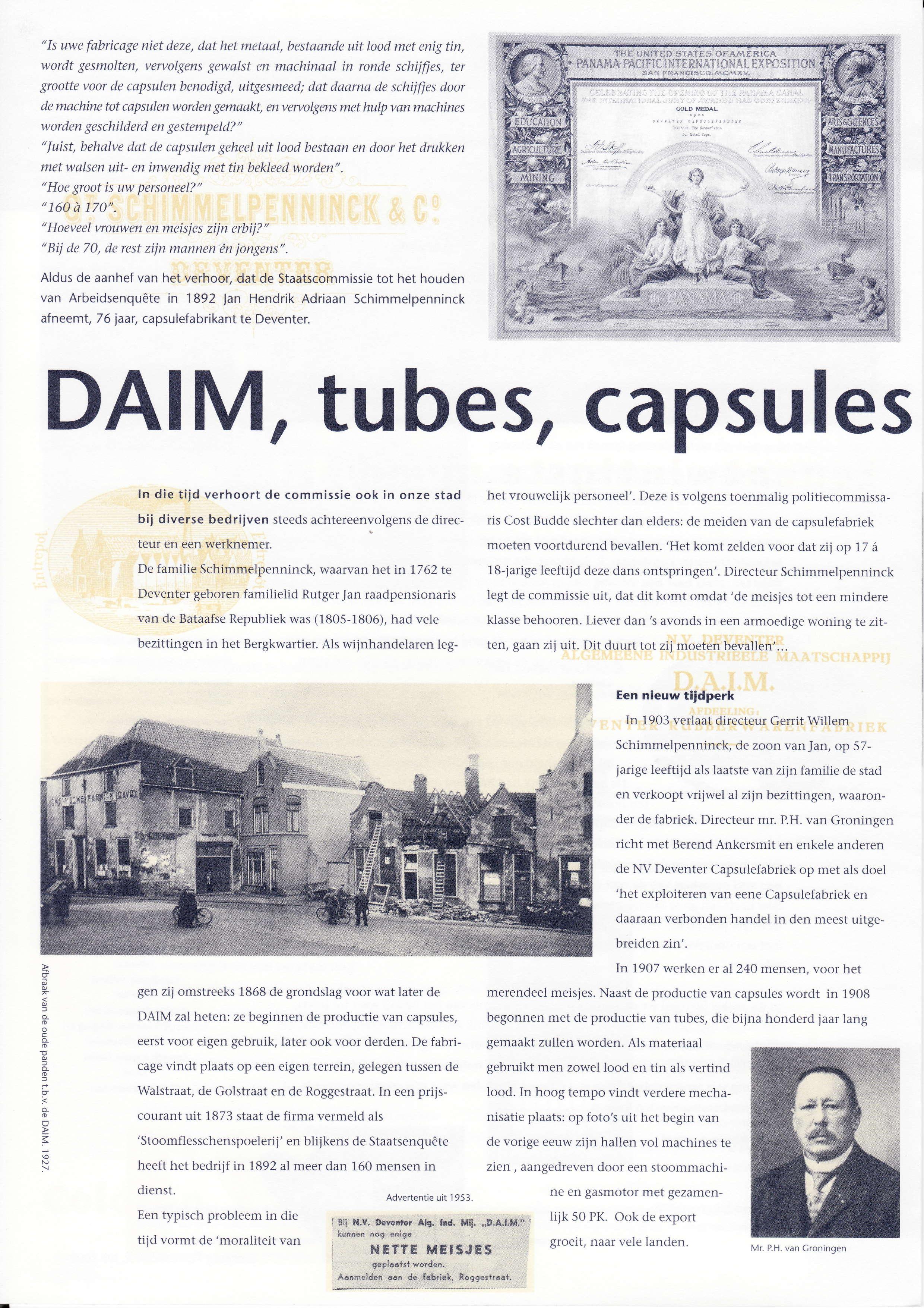 gevarieerdeproductie.Bij het 50-jarigiubileum op 17iuh 1953krijgt defabriekalseerstebedrijf deZilverenErepenningmet inschrijving in het GuldenBoekvandestadDeventer.In1967 ver werft de DAIM het heleaandelenkapitaalvan de NV CapaluxMaatschappijin Den Bosch;dit bedrijf produceerdeeenspecialecapsulevolgens Deenspatent.