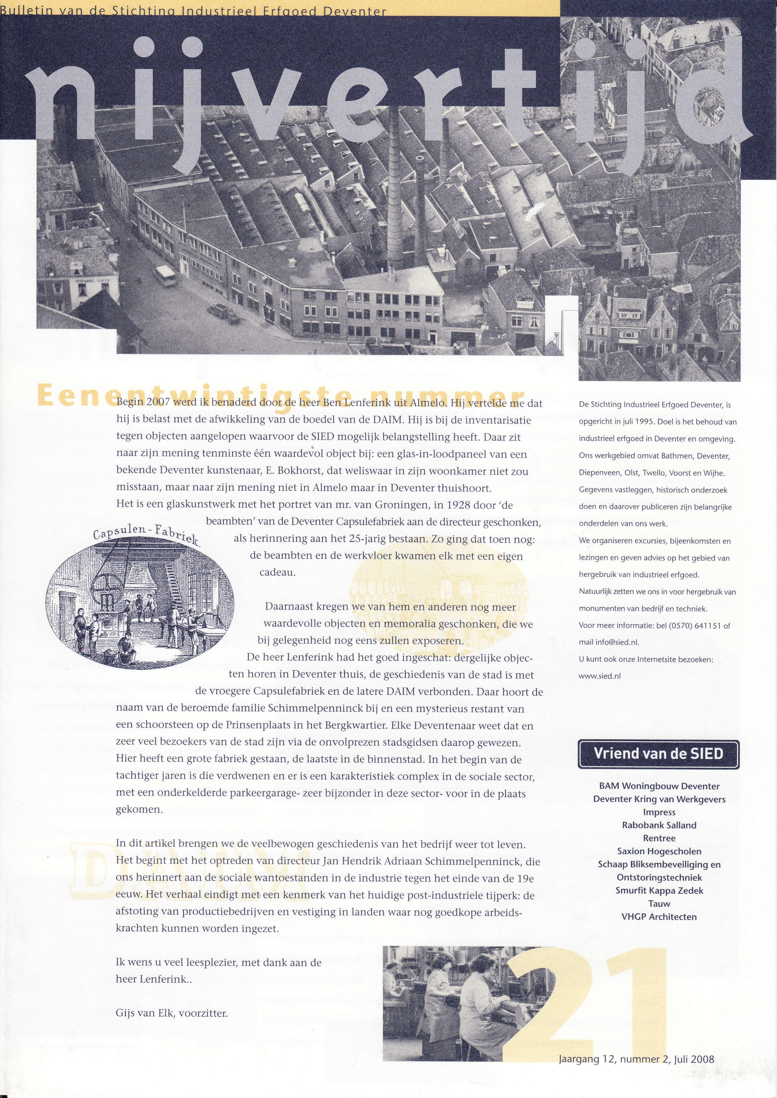 DeheerLenferinkhad het goedingeschat:dergelijkeobjecten horen in Deventerthuis, degeschiedenisvan de stadismet devroegereCapsulefabrieken delatereDAIM verbonden.Daarhoort de naamvan deberoemdefamilie Schimmelpenninckbij en eenmysterieusrestantvan eenschoorsteenop dePrinsenplaatsin het Bergkwartier.ElkeDeventenaarweetdat en zeerveelbezoekersvan de stadzijnvia deonvoiprezenstadsgidsendaaropgewezen. Hier heefteengrotefabriekgestaan,delaatstein debinnenstad.In het beginvan de tachtigerjarenis dieverdwenenen eris eenkarakteristiekcomplexin de socialesector, met eenonderkelderdeparkeergarage-zeerbijzonderin dezesector-voor in deplaats gekomen.