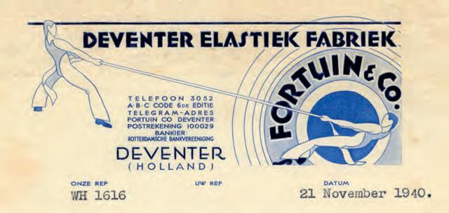 De industrie in Deventer was en is zeer gevarieerd. In het vorige nummer was een van onze iconen, Ten Zijthoff, het onderwerp. Nu is dat Elastiekfabriek Fortuin. Geen glamourbedrijf: elastiek doet nu eenmaal onzichtbaar zijn werk. Op de oorspronkelijke plek van Fortuin staan al tientallen jaren woningen. Op het industrieterrein heeft Fortuin maar 10 jaar gezeten en dat alweer bijna 30 jaar geleden. Aandacht voor dit soort minder opvallende bedrijven vinden we óók nodig. Een bijzonder detail vind ik de thuiswerkers: ik kom zelf uit een familie van kledingdetaillisten, een nu niet meer bestaand, maar vroeger eerbiedwaardig damesen herenmodeconcern. Vrijwel alle herenconfectie werd niet zomaar meegenomen: de klant paste de kleding eerst. Schouders, mouwen of broekspijpen werden opgemeten en de aanpassingen met krijt genoteerd. De pompiers boven de zaak (‘de pomp’ heette het atelier) of de thuiswerkers deden de aanpassingen, waarna de zaak het kledingstuk thuis bezorgde (dit alles lang vóór bol.com en dergelijke).